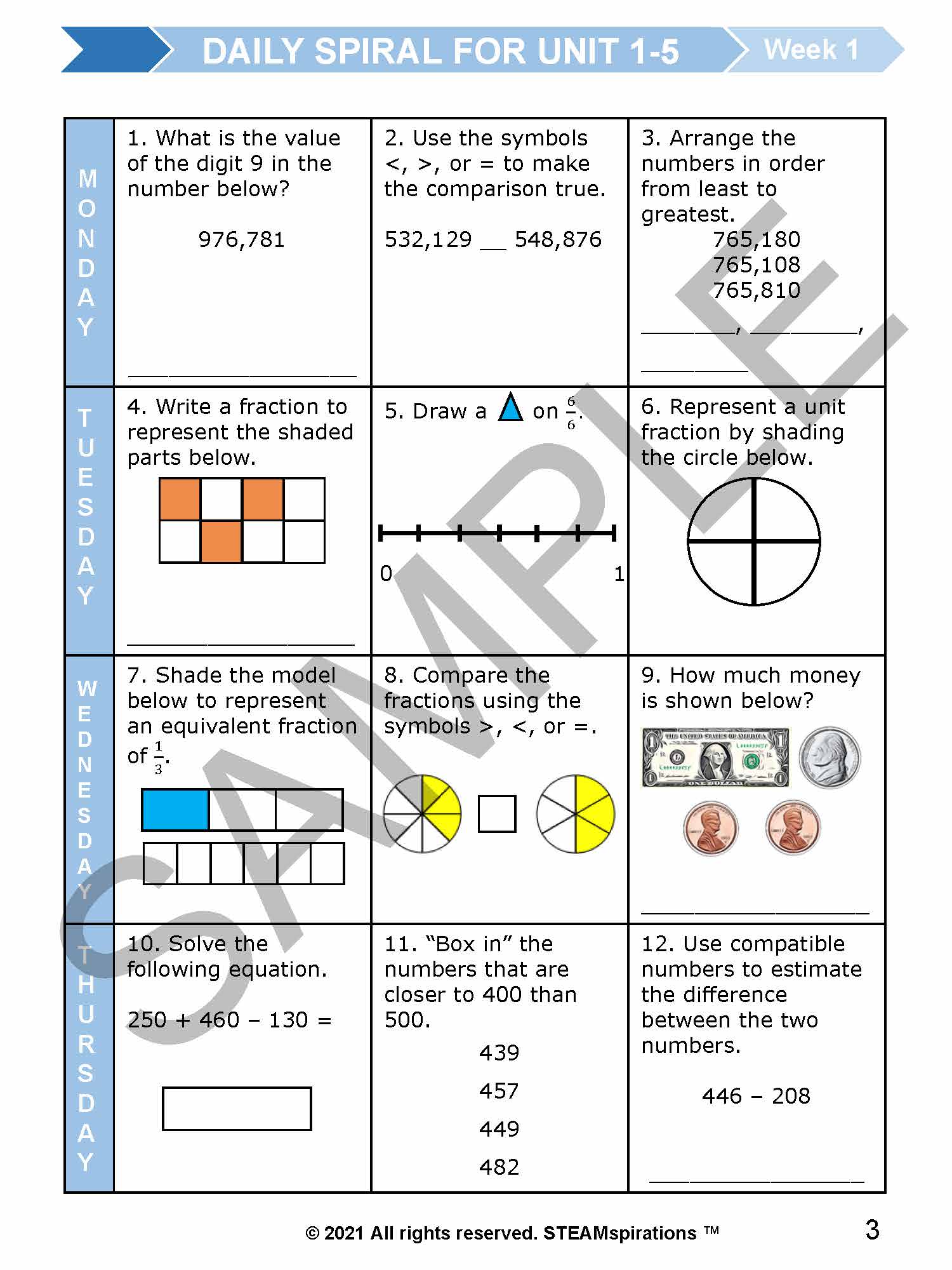 - Daily Spirals: We have structured our math program to ensure continuous review by revisiting all previously taught skills each week, thus ensuring mastery. Normally, by the 7th unit, students are reviewing over 15 skills bi-weekly, covering all material from the first four units. (HIghlight daily spiral by teks.