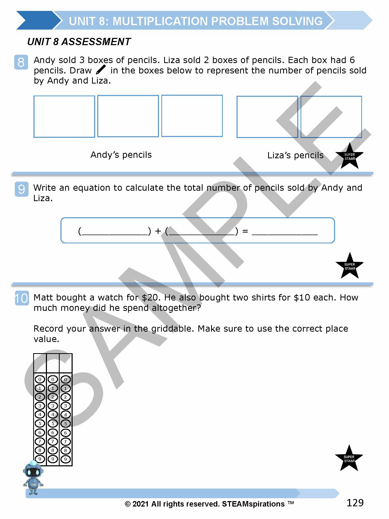 - Skill Building/Independent Practice: Lessons are designed to strengthen students’ math skills and problem-solving abilities through word problems, including STAAR 2.0 questions marked by a small star symbol.