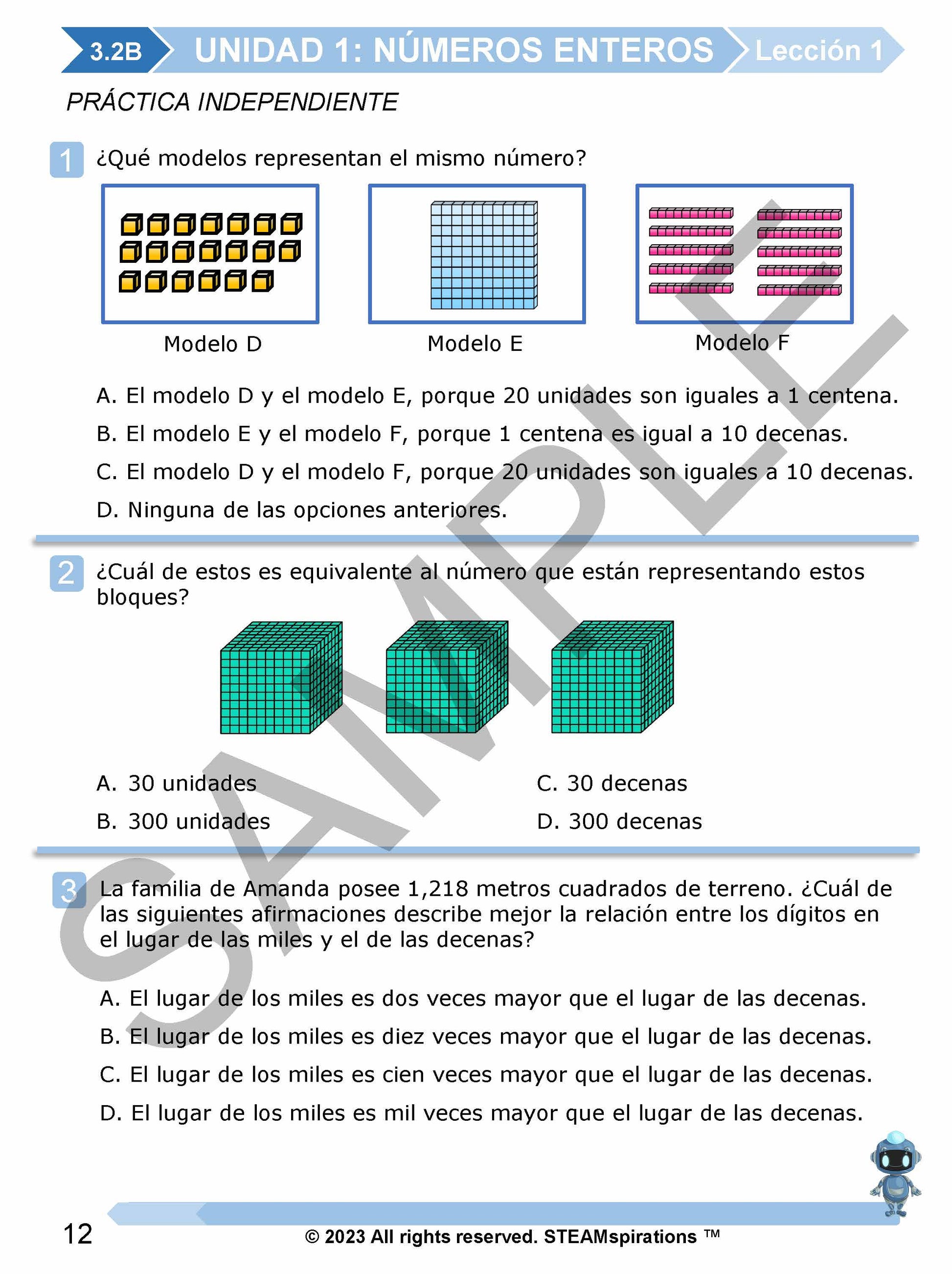Construcción de Habilidades/Práctica Independiente: Las lecciones están diseñadas para fortalecer las habilidades matemáticas y las habilidades de resolución de problemas de los estudiantes a través de problemas de palabras, incluyendo preguntas STAAR 2.0 marcadas con un pequeño símbolo de estrella.