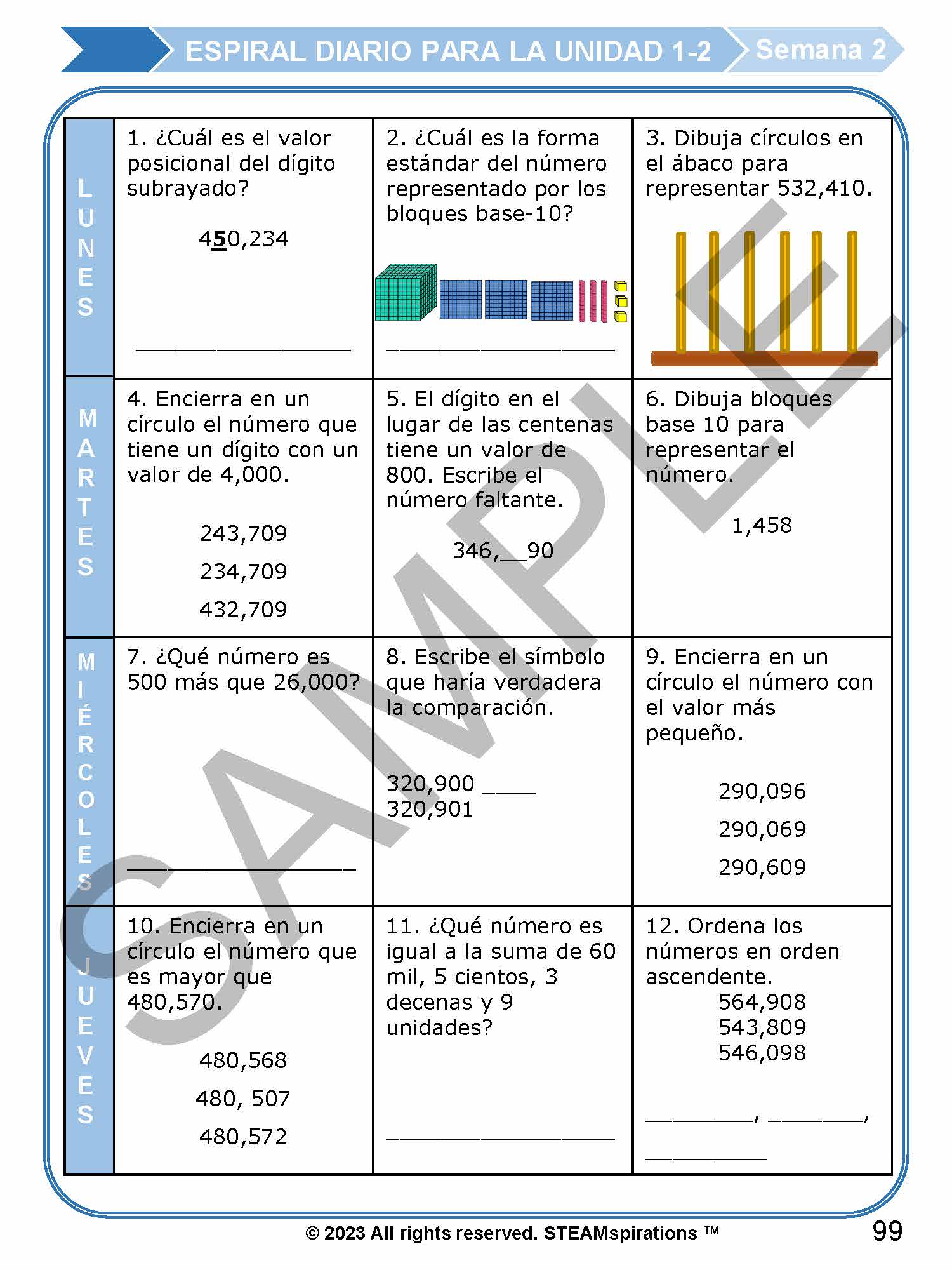 Preguntas de Resolución de Problemas: Más allá de las espirales diarias, cada lección incluye preguntas de resolución de problemas, también conocidas como preguntas del Problema del Día (P.O.D.), que refuerzan las habilidades de la lección enseñada previamente.