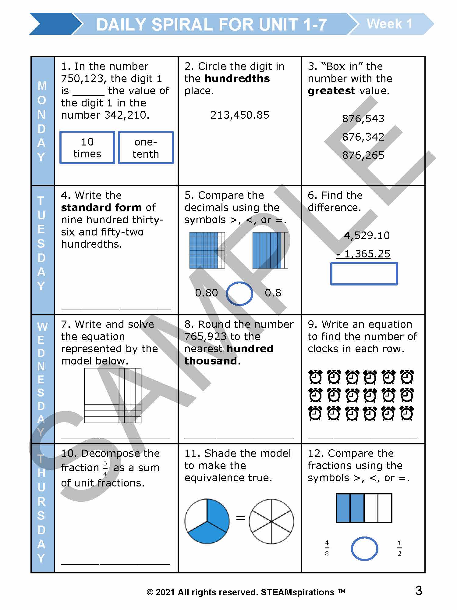- Daily Spirals: We have structured our math program to ensure continuous review by revisiting all previously taught skills each week, thus ensuring mastery. Normally, by the 7th unit, students are reviewing over 15 skills bi-weekly, covering all material from the first four units. (HIghlight daily spiral by teks.
