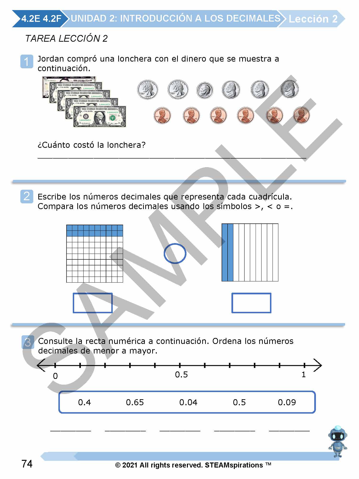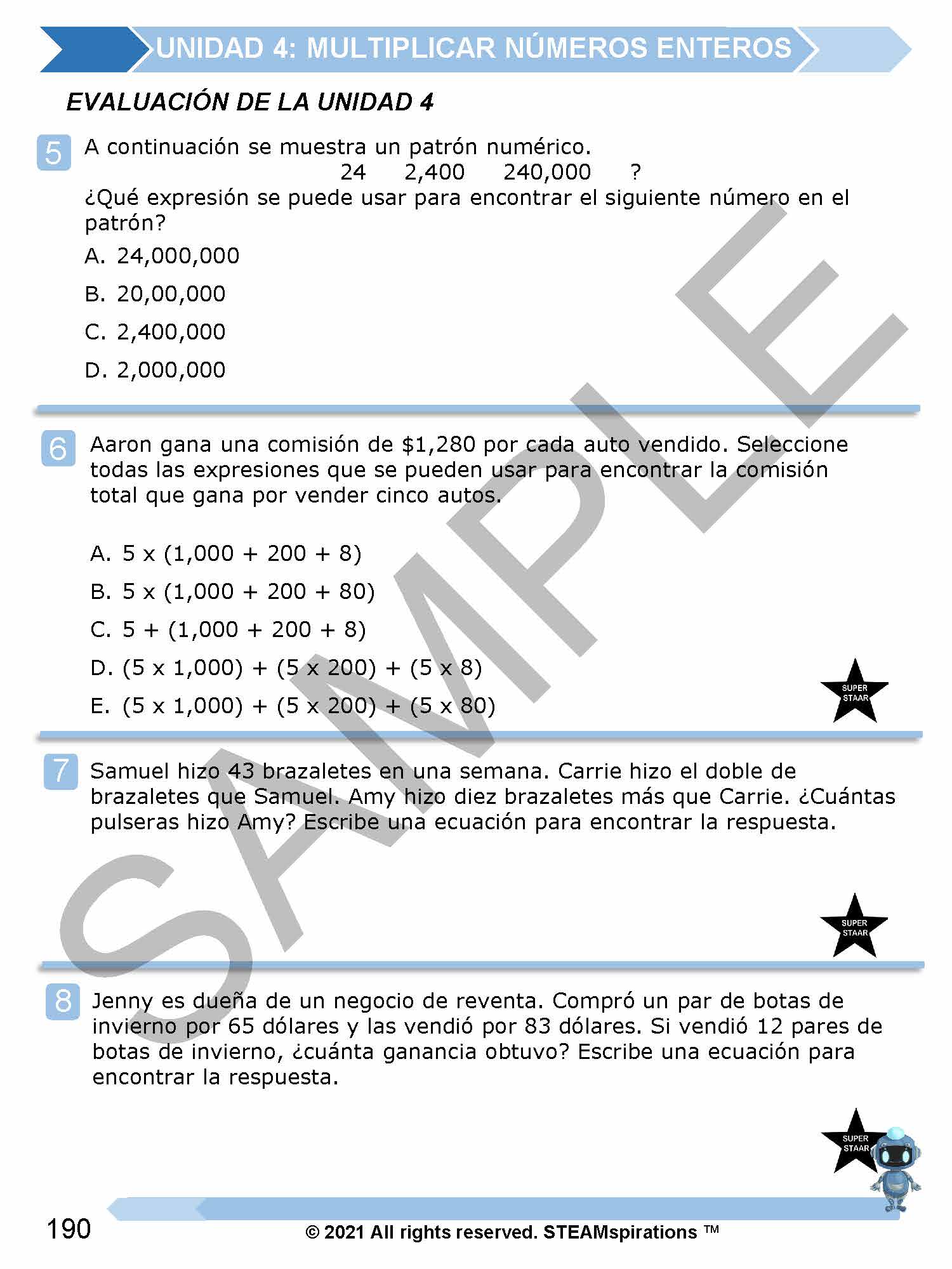Construcción de Habilidades/Práctica Independiente: Las lecciones están diseñadas para fortalecer las habilidades matemáticas y las habilidades de resolución de problemas de los estudiantes a través de problemas de palabras, incluyendo preguntas STAAR 2.0 marcadas con un pequeño símbolo de estrella.