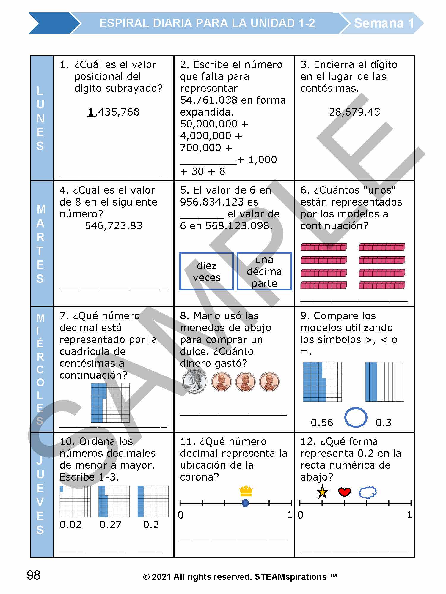 Preguntas de Resolución de Problemas: Más allá de las espirales diarias, cada lección incluye preguntas de resolución de problemas, también conocidas como preguntas del Problema del Día (P.O.D.), que refuerzan las habilidades de la lección enseñada previamente.