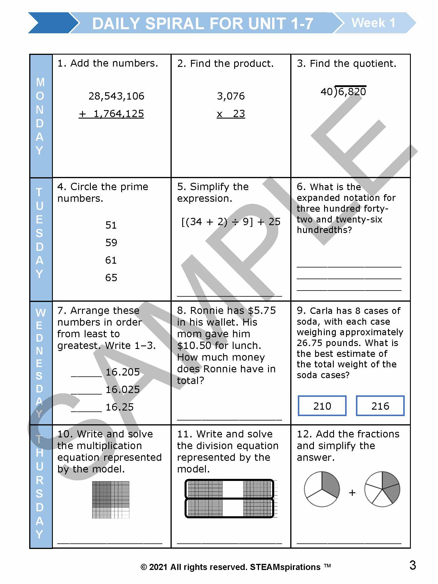 - Daily Spirals: We have structured our math program to ensure continuous review by revisiting all previously taught skills each week, thus ensuring mastery. Normally, by the 7th unit, students are reviewing over 15 skills bi-weekly, covering all material from the first four units. (HIghlight daily spiral by teks.