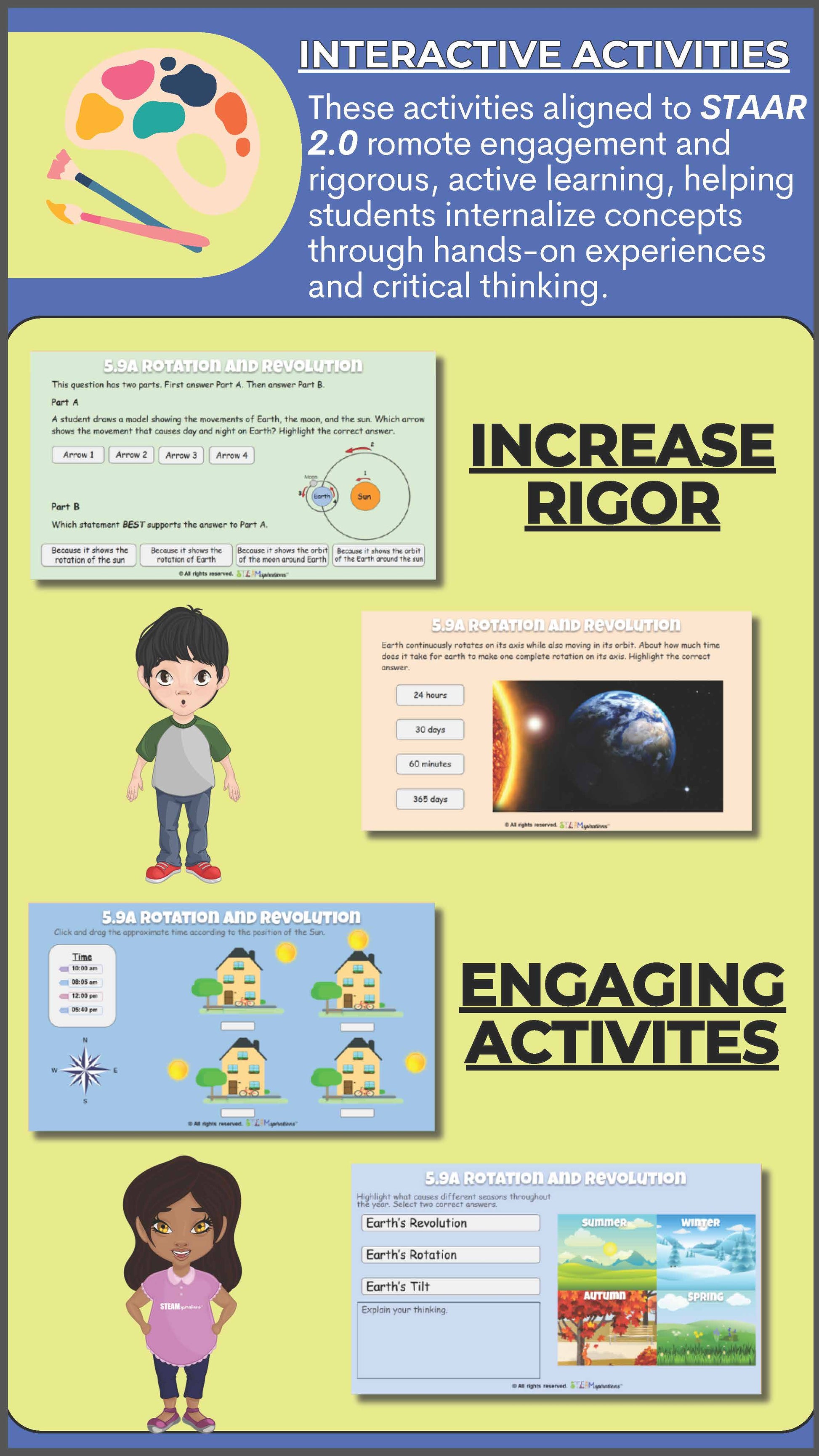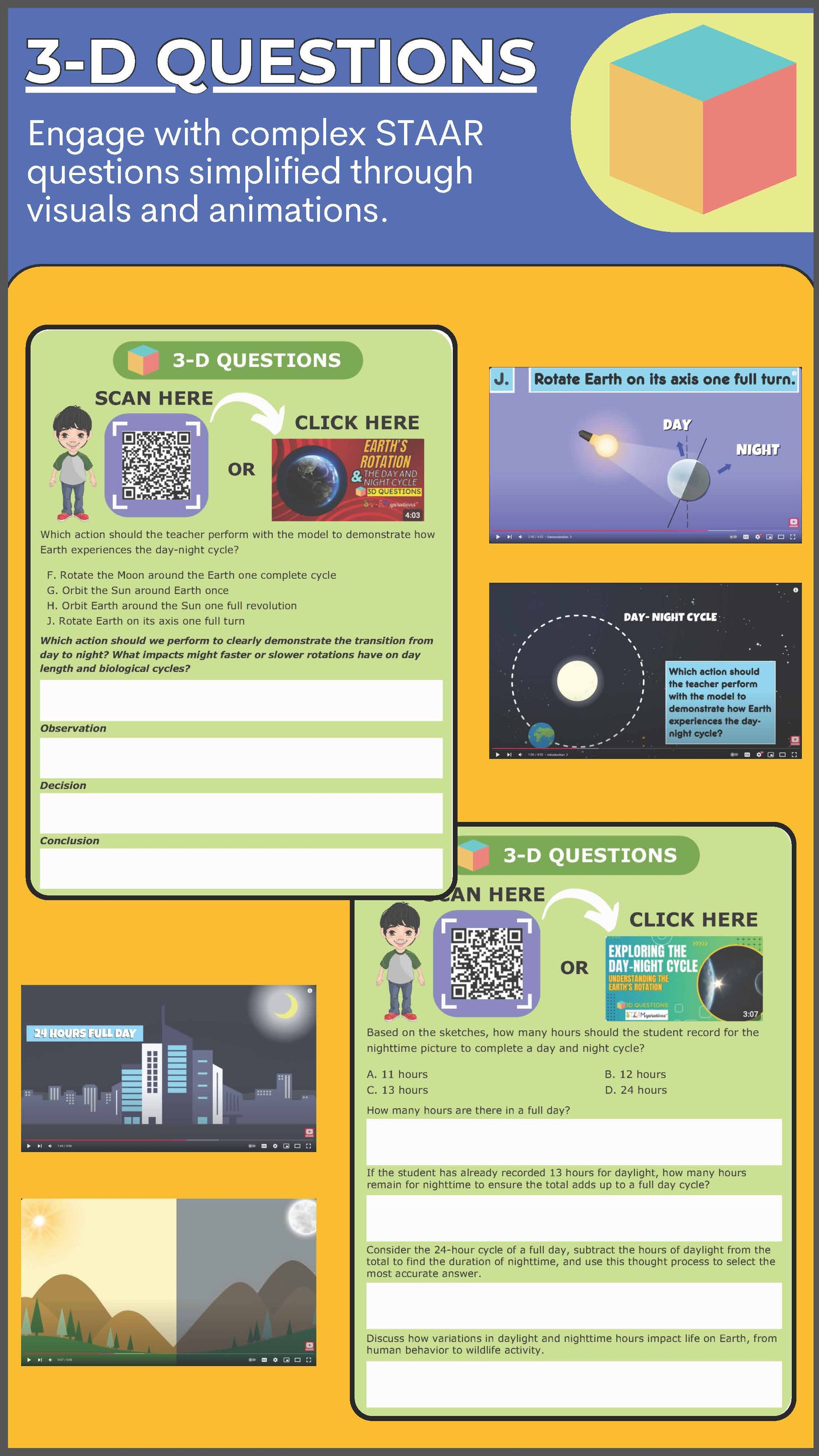 Incorporating 3-D questions, students analyze, predict, and evaluate scenarios related to Earth’s movements and their impacts. These inquiries encourage a deeper understanding of natural cycles and their practical applications.