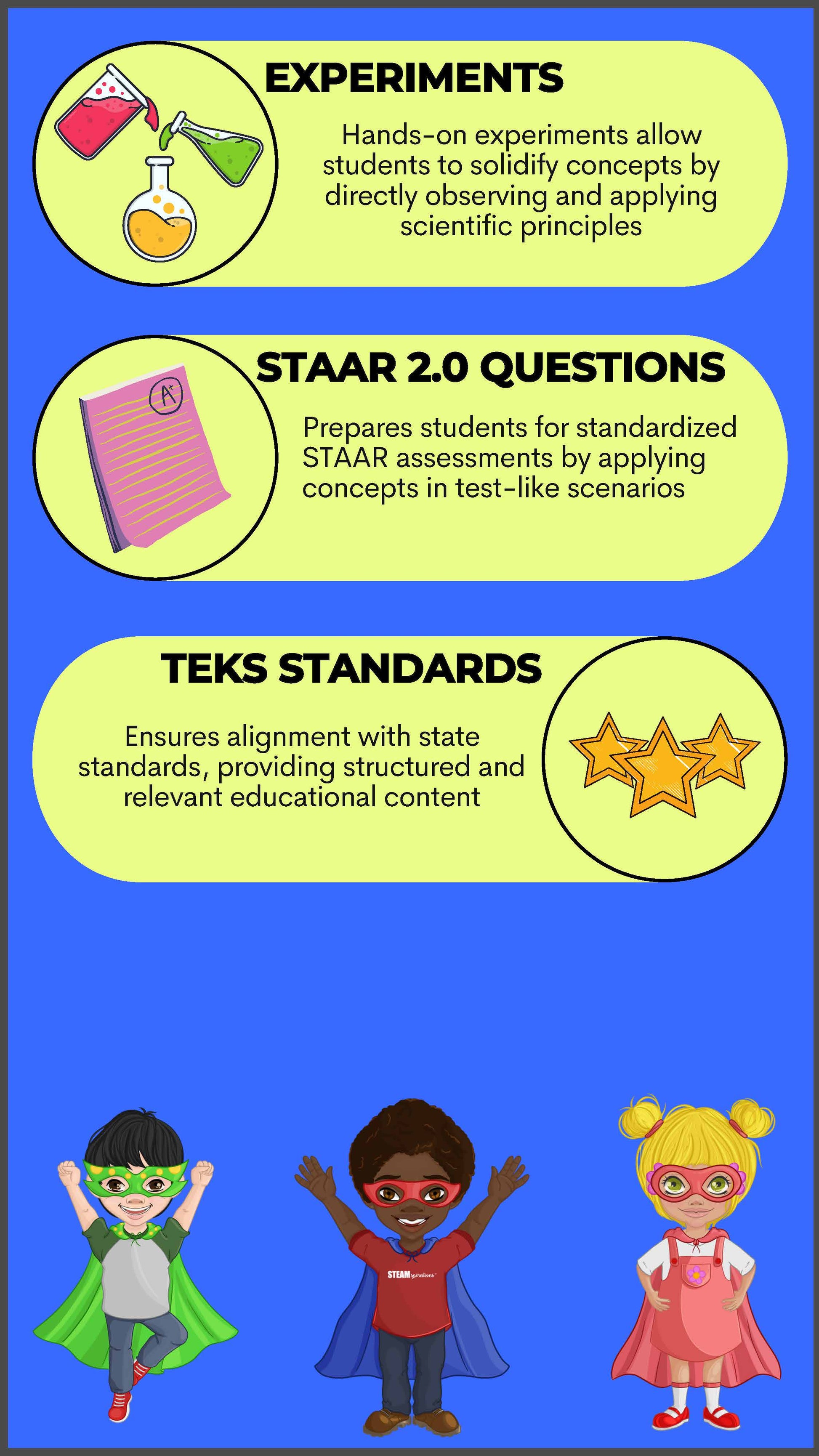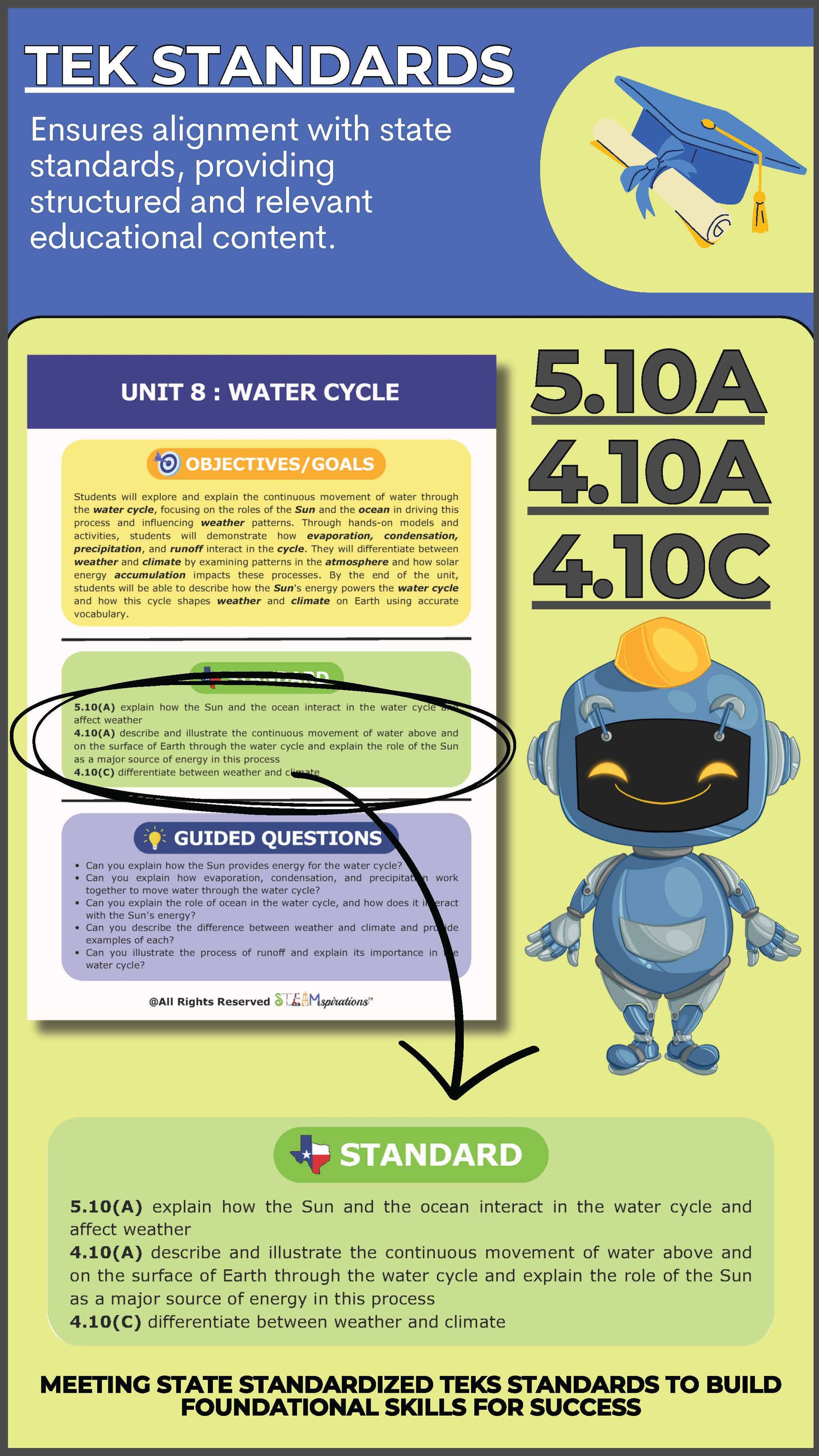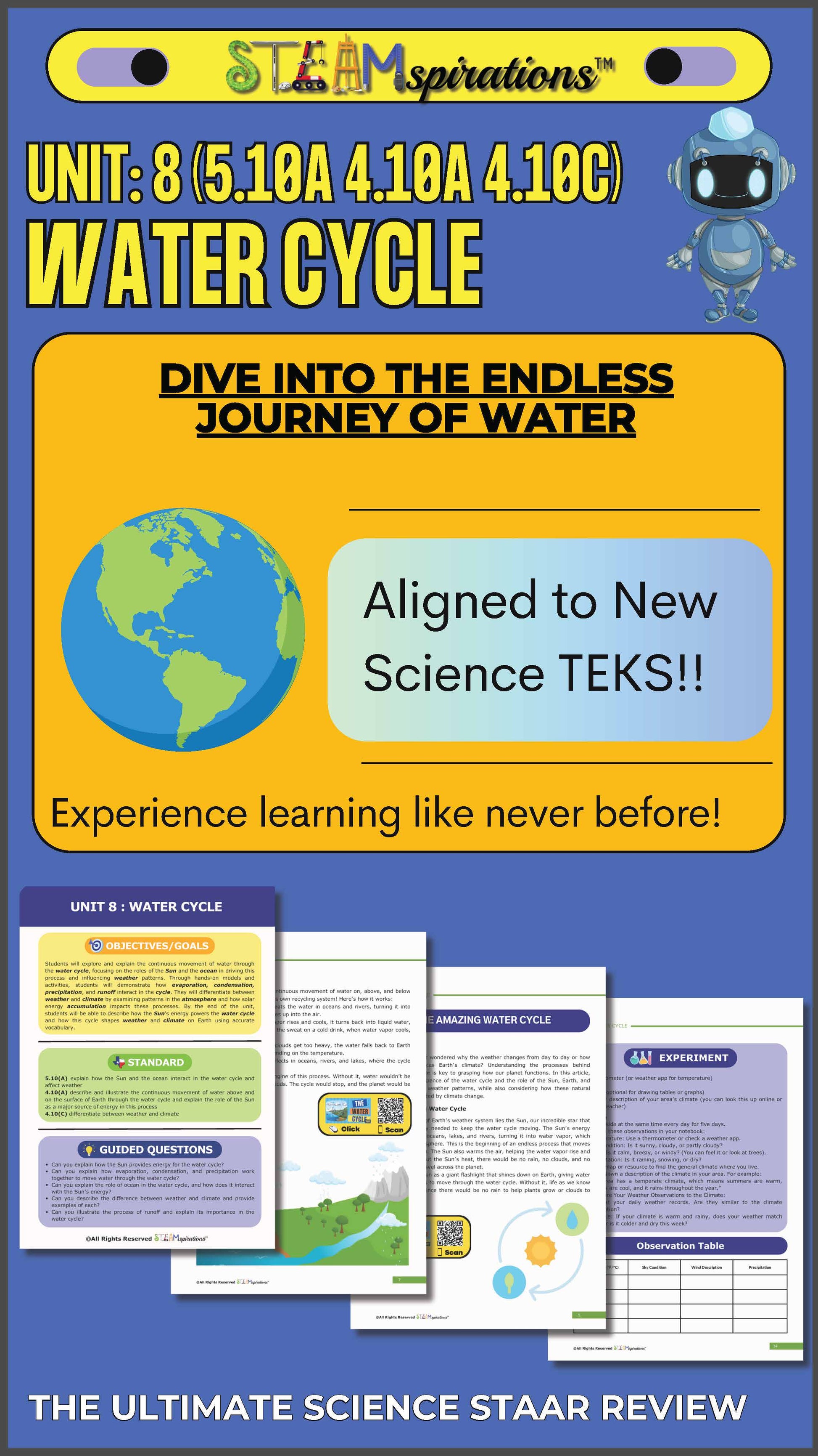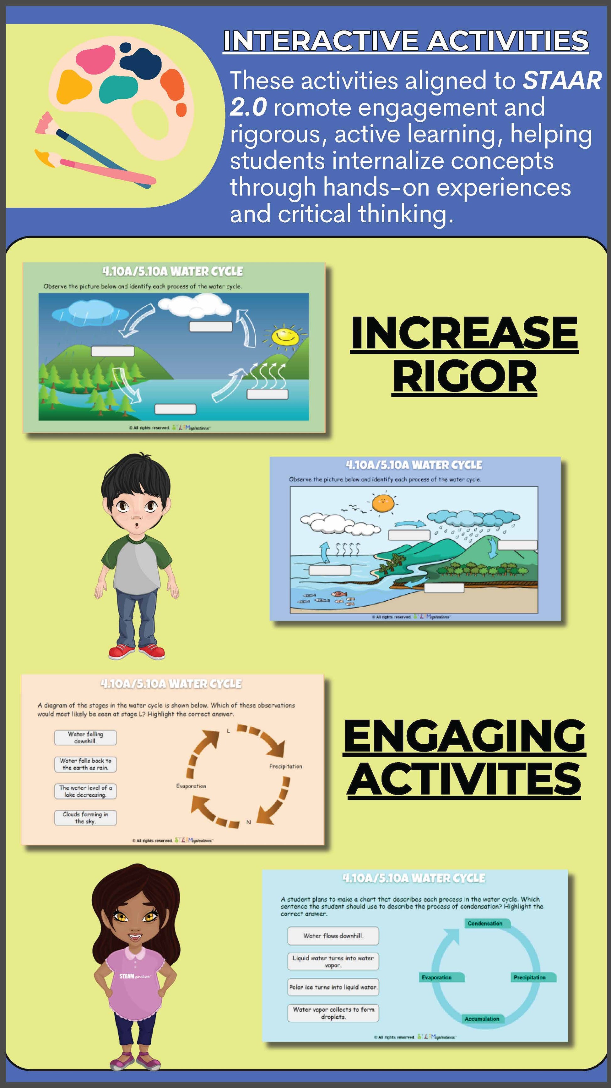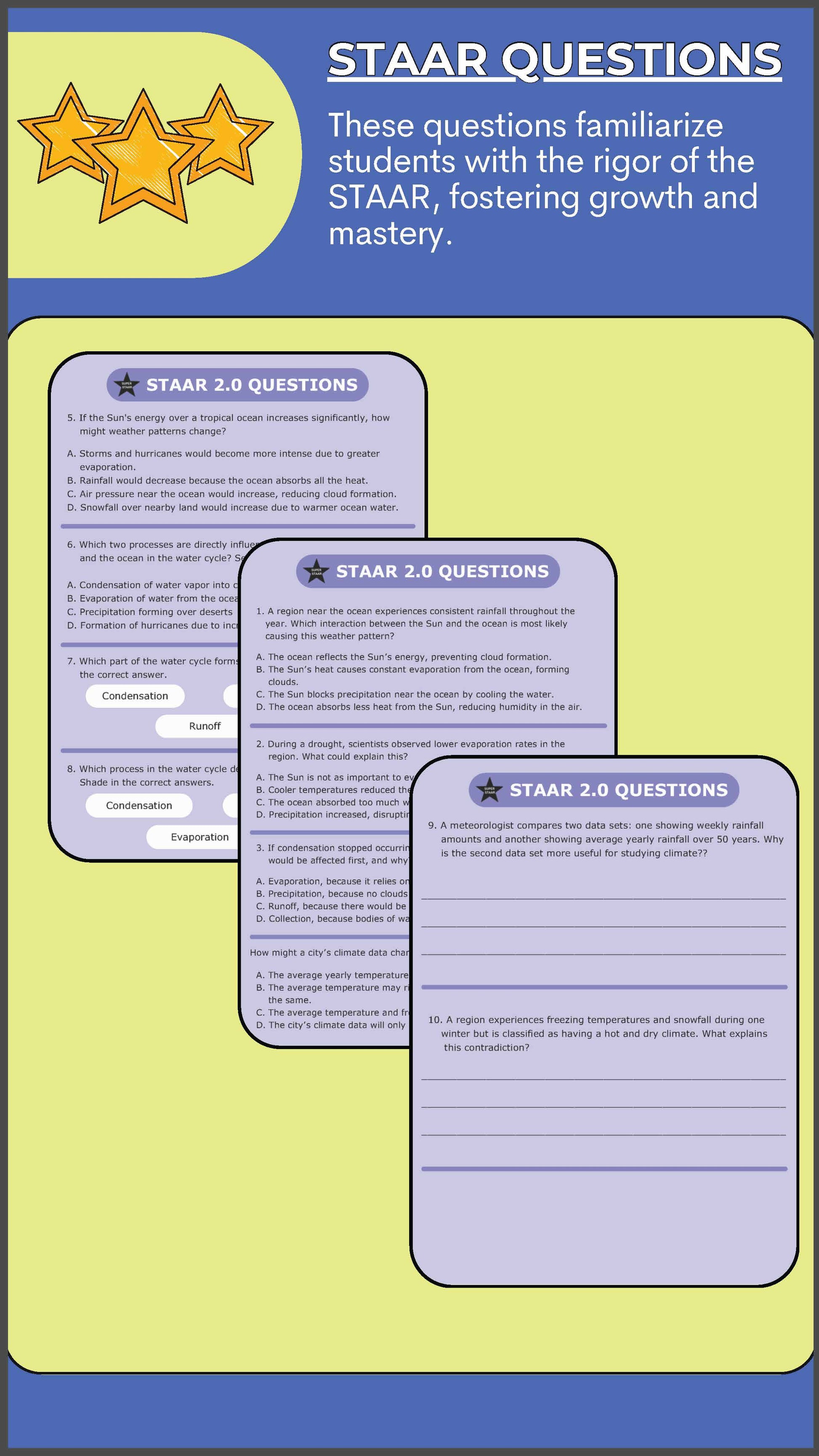 Periodic assessments and STAAR 2.0-aligned questions ensure students achieve mastery of water cycle concepts, building confidence and readiness for future academic success.