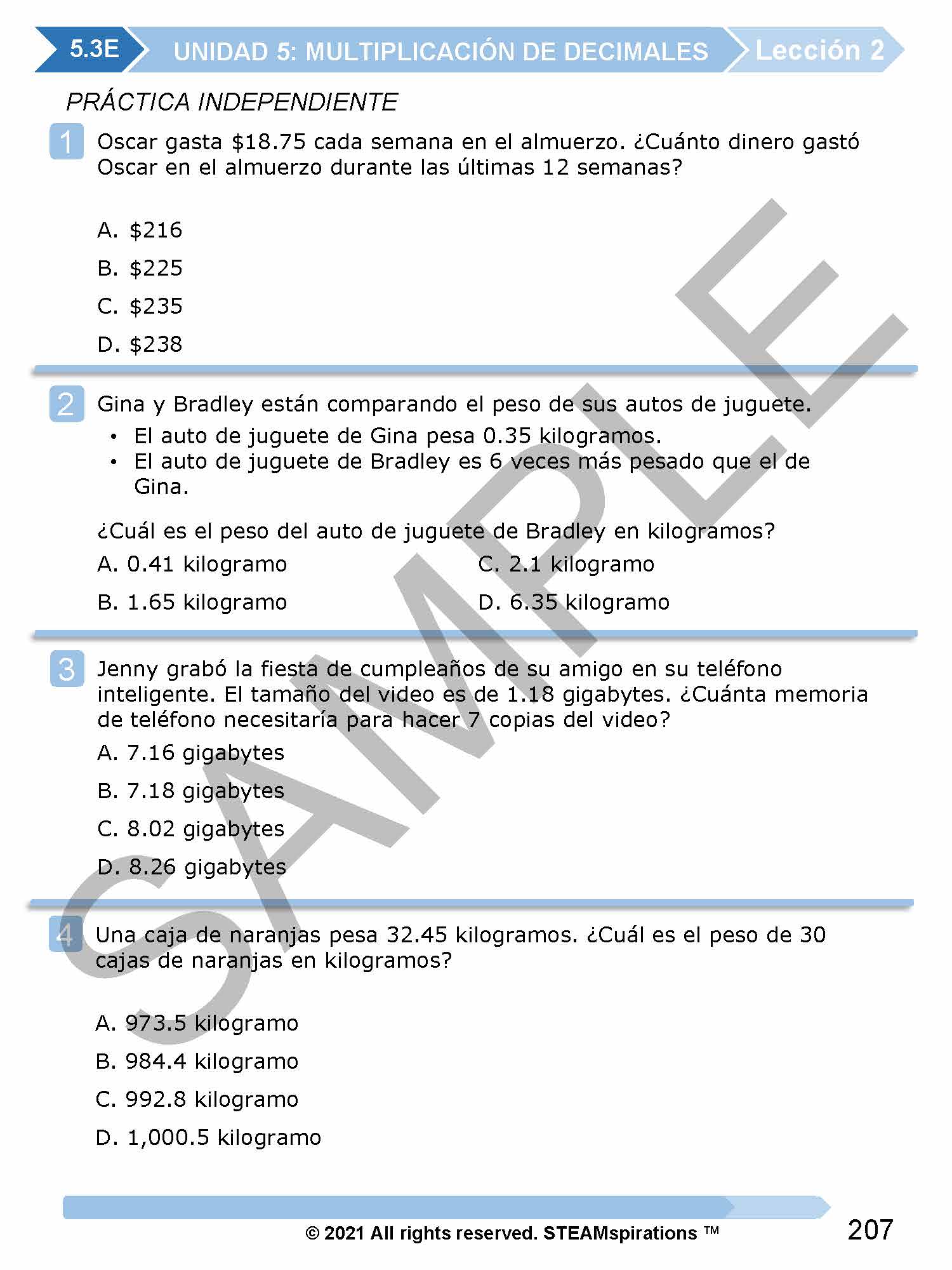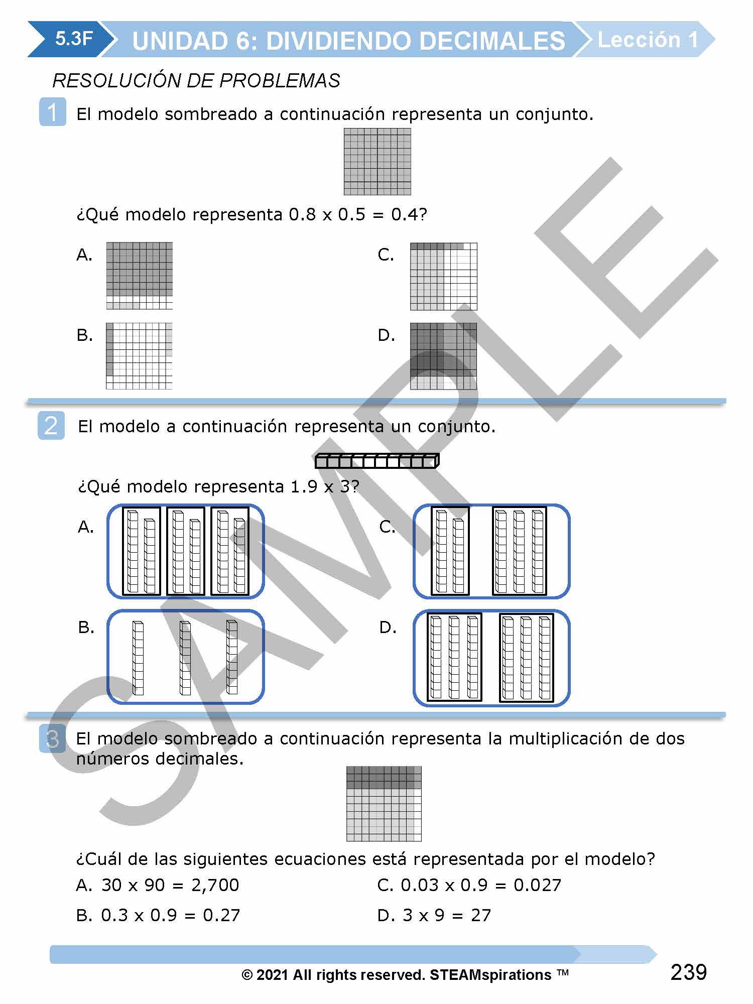 Construcción de Habilidades/Práctica Independiente: Las lecciones están diseñadas para fortalecer las habilidades matemáticas y las habilidades de resolución de problemas de los estudiantes a través de problemas de palabras, incluyendo preguntas STAAR 2.0 marcadas con un pequeño símbolo de estrella.