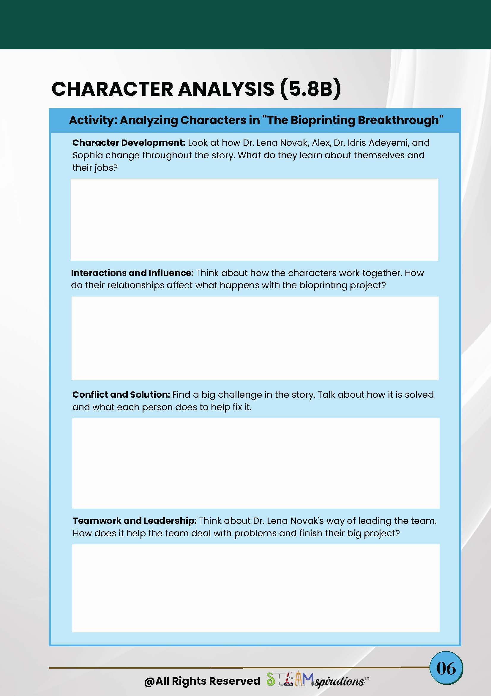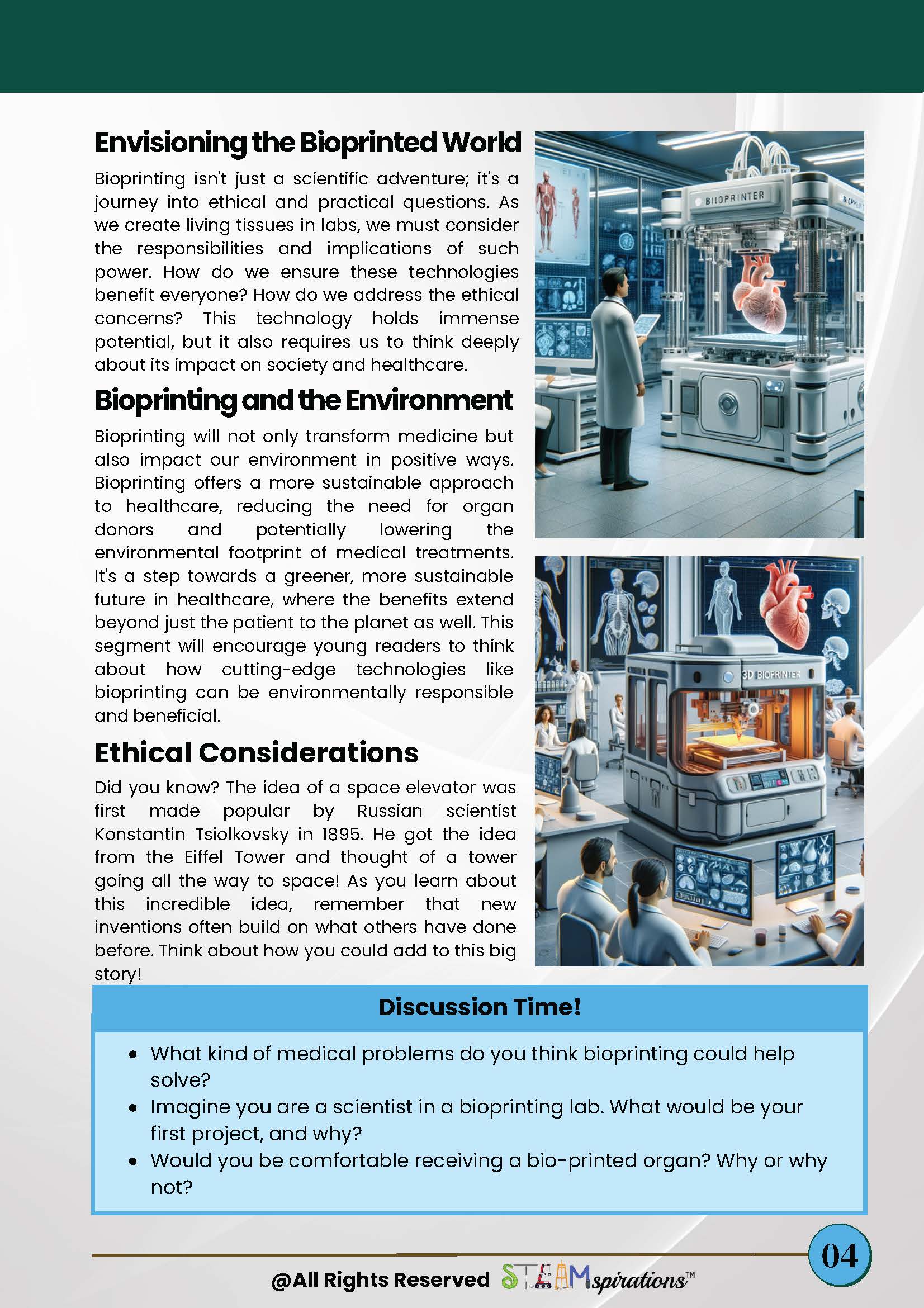 - Medical Bioprinting: Discover the applications of Bioprinting in medicine, exploring its processes, impacts, and ethical considerations. Engage in character analysis activities based on fictional Bioprinting stories and write narratives exploring the human impact of this revolutionary technology.