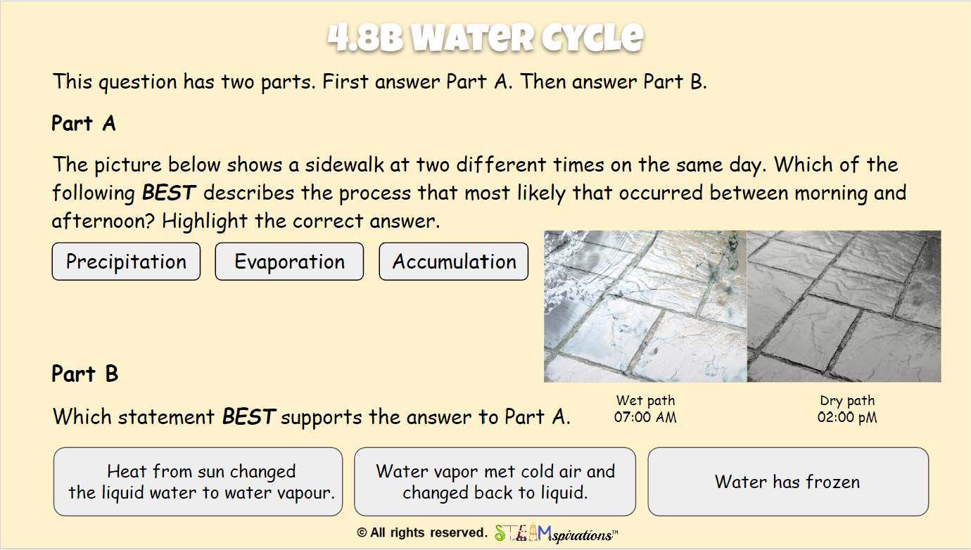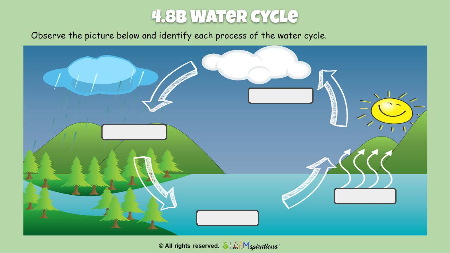 - 4.8B Describe and illustrate the continuous movement of water above and on the surface of Earth through the water cycle and explain the role of the Sun as a major source of energy in this process