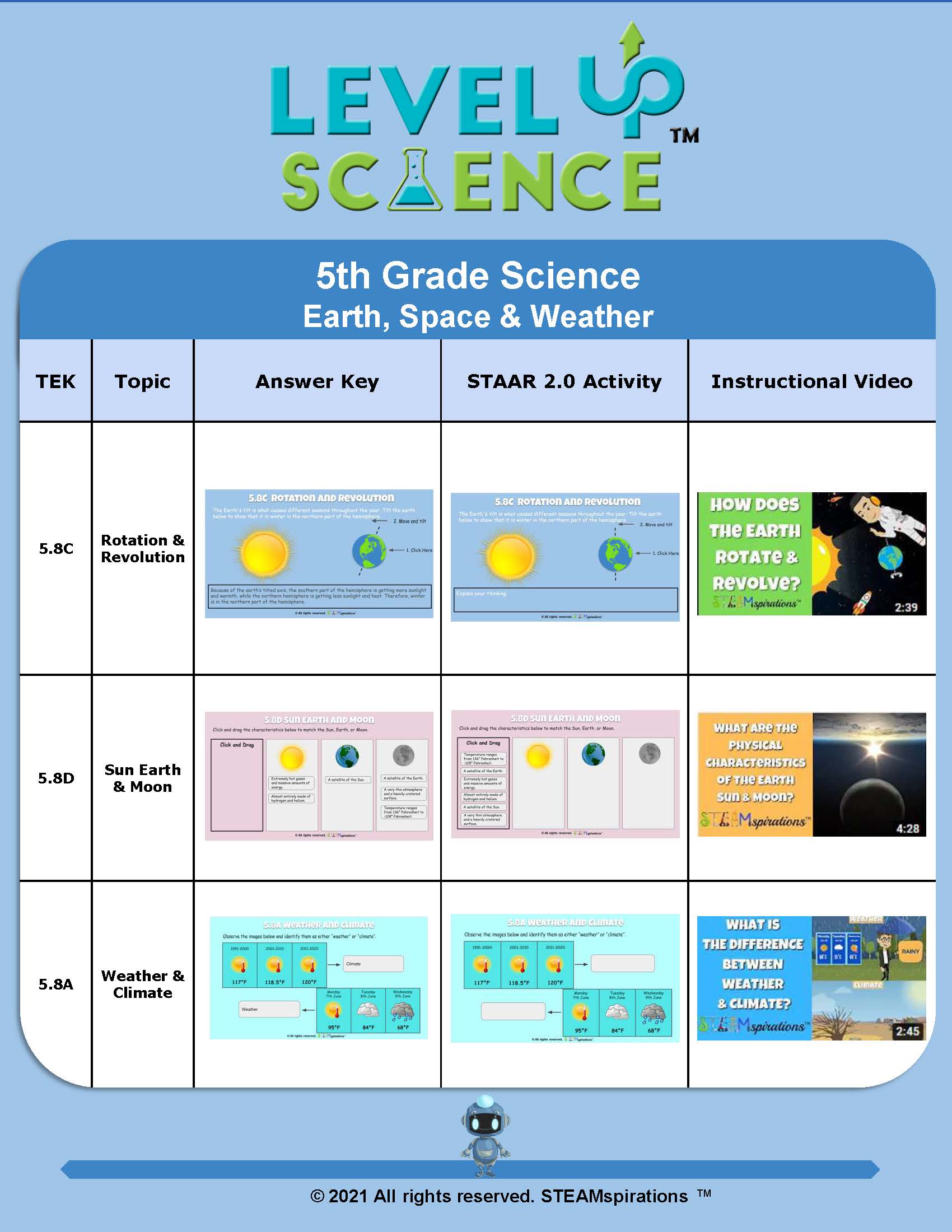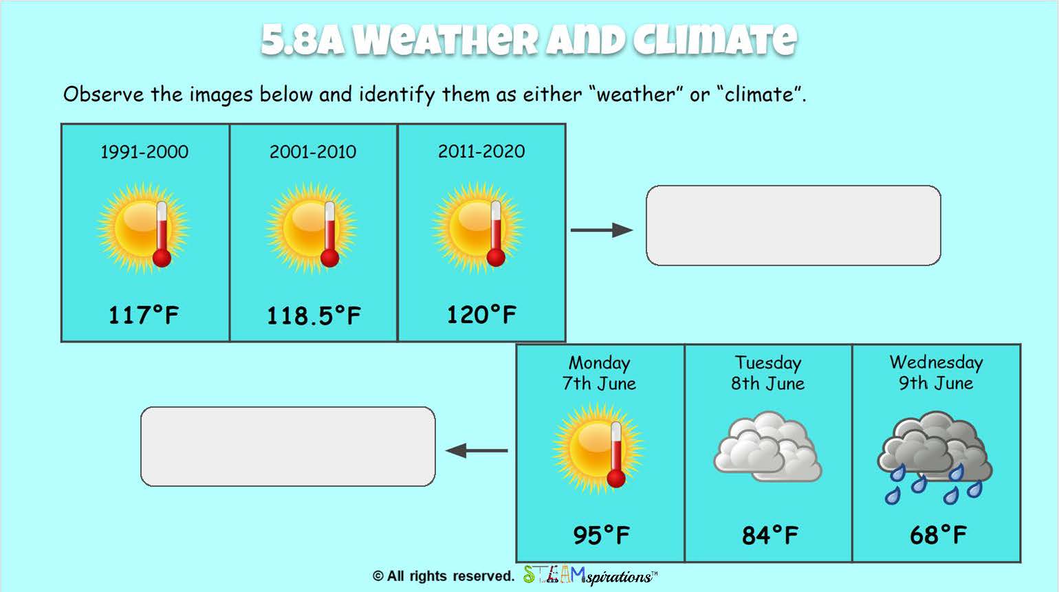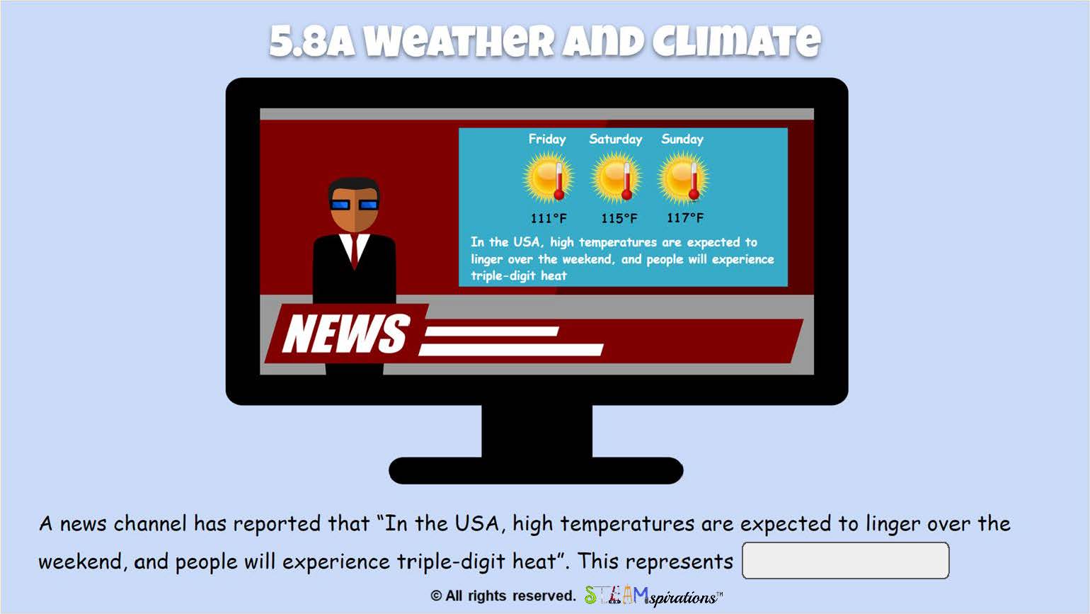 - 5.8A Recognizable patterns in the natural world and among the Sun, Earth, and Moon system. Differentiate between weather and climate