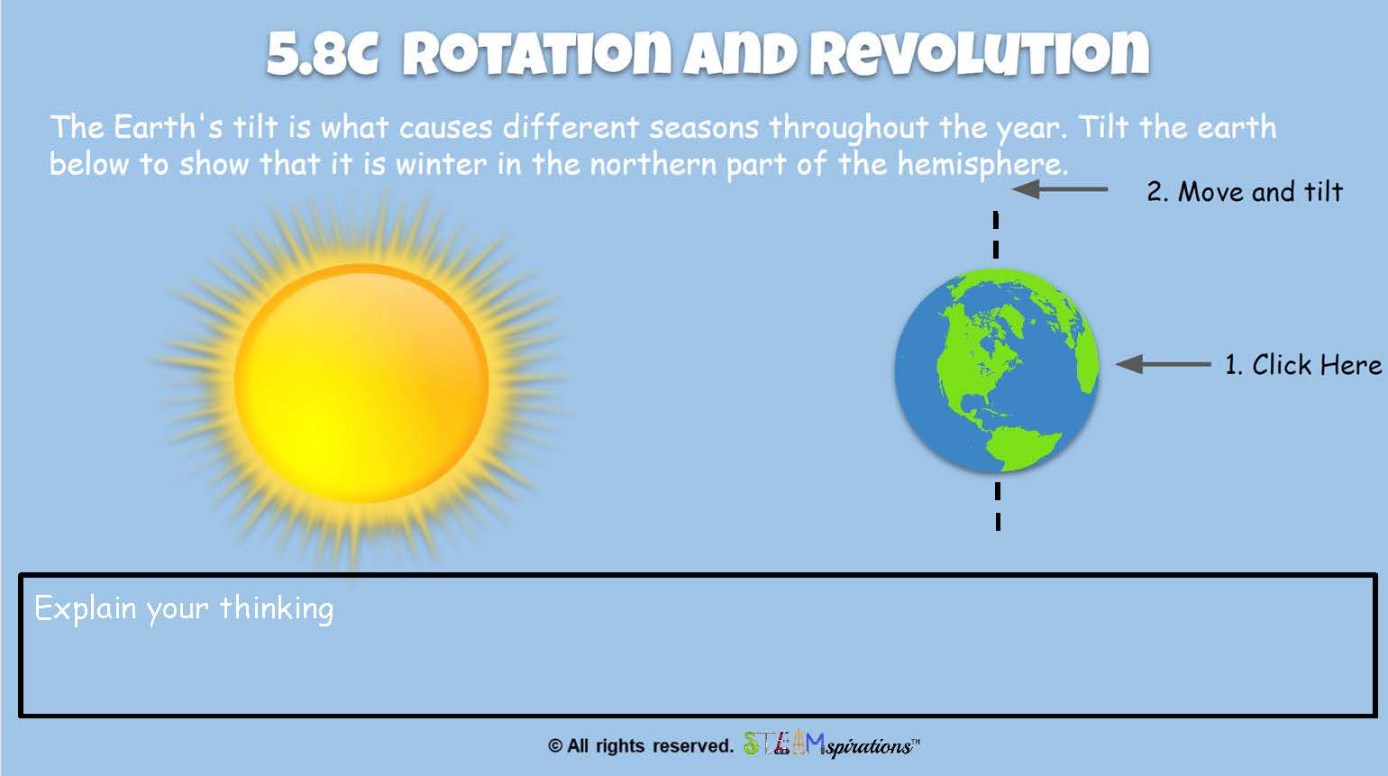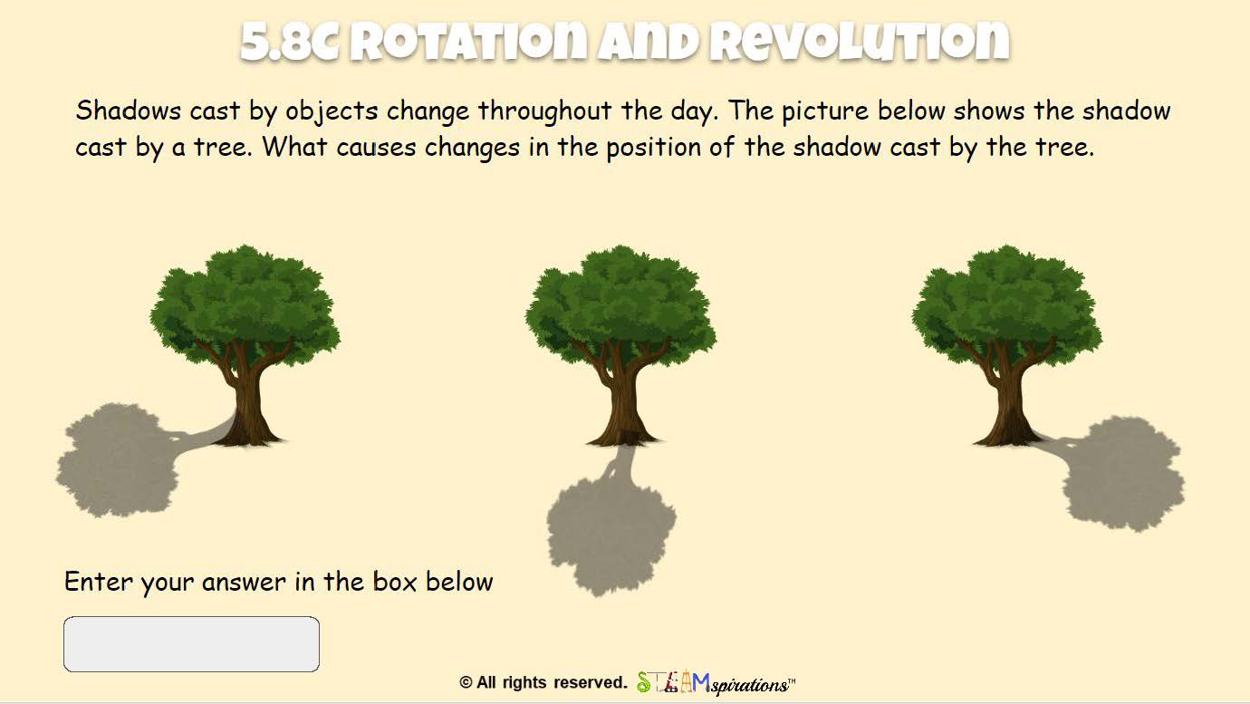 - 5.8C Demonstrate that Earth rotates on its axis once approximately every 24 hours causing the day/night cycle and the apparent movement of the Sun across the sky