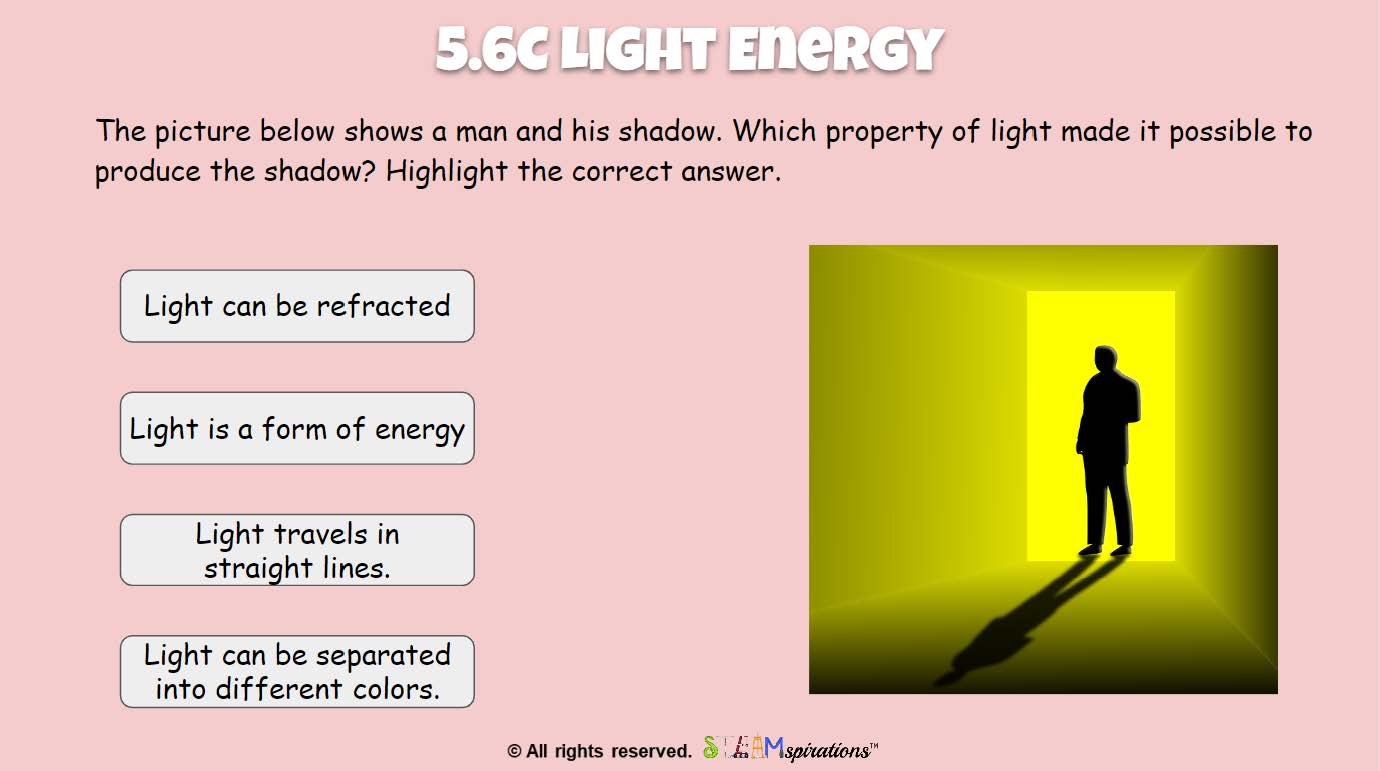 - 5.6C Demonstrate that light travels in a straight line until it strikes an object and is reflected or travels through one medium to another and is refracted