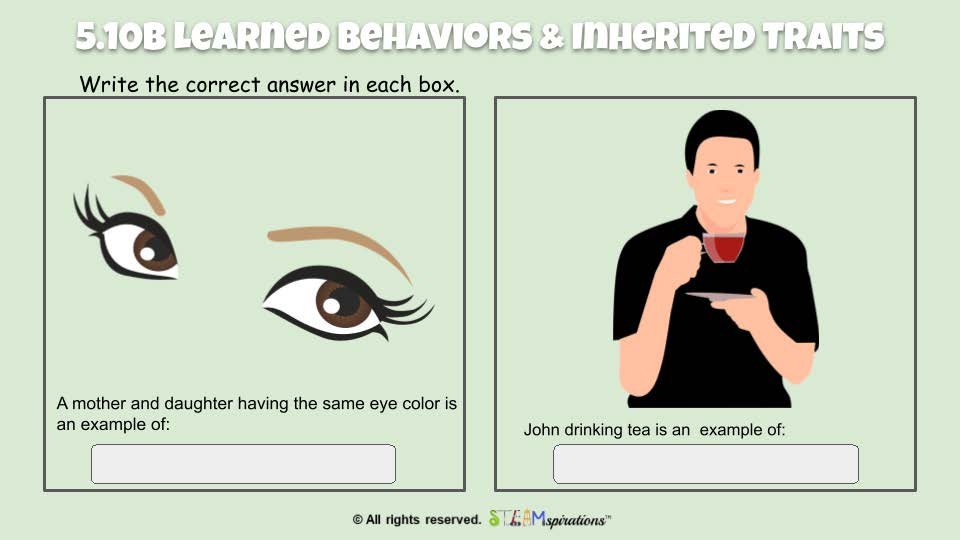5.10B Differentiate between inherited traits of plants and animals such as spines on a cactus or shape of a beak and learned behaviors such as an animal learning tricks or a child riding a bicycle