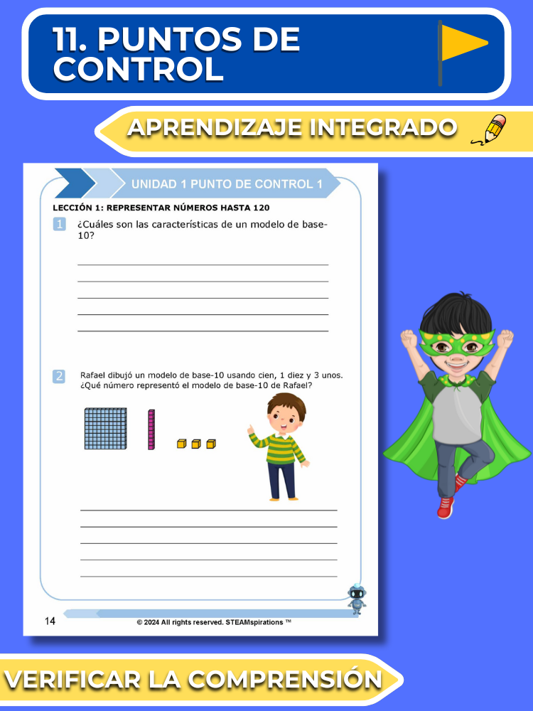 Puntos de Control: Al final de cada lección, los puntos de control incluyen un ejercicio de escritura y una pregunta de resolución de problemas para evaluar la comprensión y consolidar el aprendizaje.