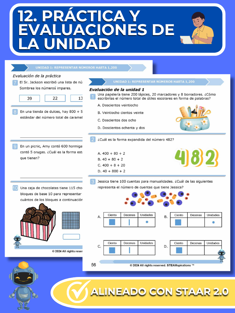 Prácticas y Evaluaciones de Unidades: Reflejando el rigor del examen STAAR, cada unidad incluye una evaluación de práctica y una evaluación de unidad integral con preguntas STAAR 2.0.