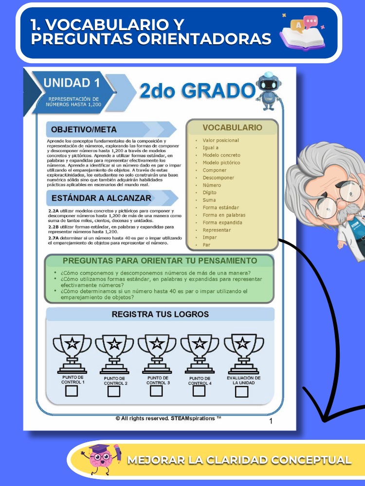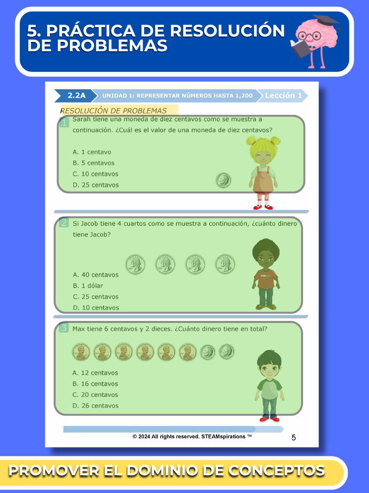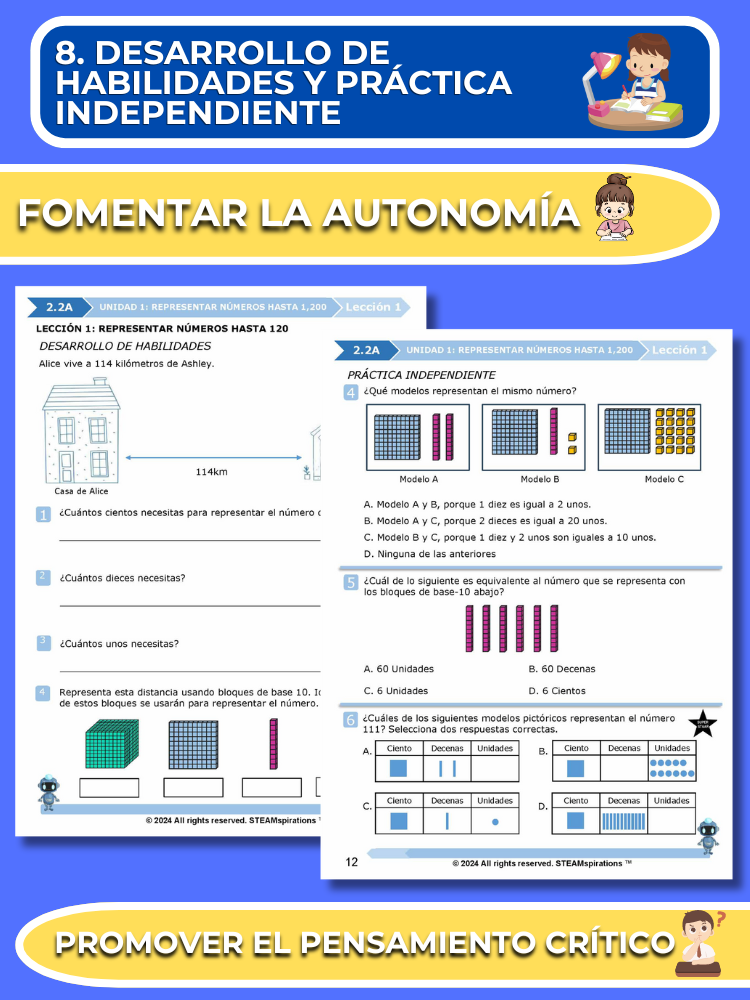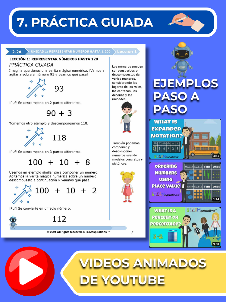 Práctica Guiada: Cada unidad incluye secciones de práctica guiada diseñadas para enseñar efectivamente nuevos TEKs/Habilidades. Estas se pueden utilizar junto con nuestros atractivos videos de instrucción animados, mejorando la experiencia de aprendizaje.