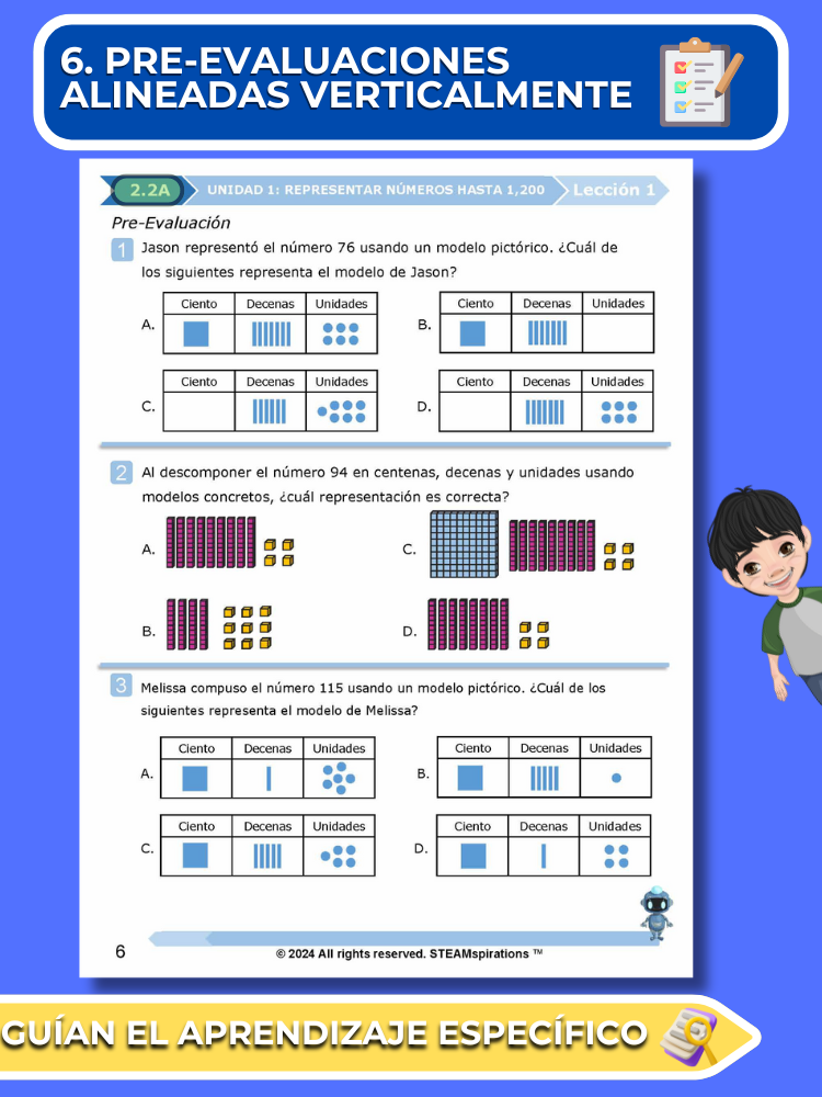 Pre-Evaluaciones Alineadas Verticalmente: Nuestro enfoque comienza cada unidad con una pre-evaluación sucinta que se alinea verticalmente con los nuevos TEKs introducidos, permitiendo un aprendizaje enfocado y efectivo.