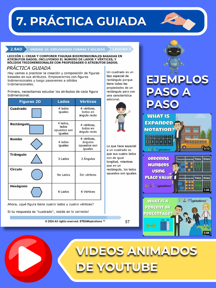 - Práctica Guiada: Cada unidad incluye secciones de práctica guiada diseñadas para enseñar efectivamente nuevos TEKs/Habilidades. Estas se pueden utilizar junto con nuestros atractivos videos de instrucción animados, mejorando la experiencia de aprendizaje.