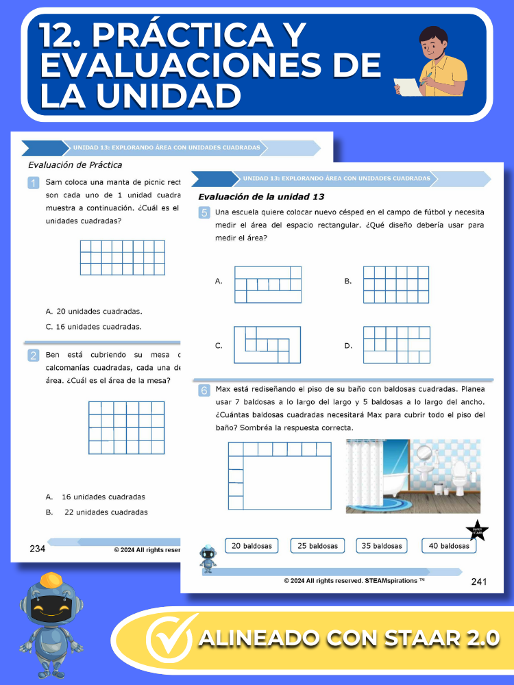 - Prácticas y Evaluaciones de Unidades: Reflejando el rigor del examen STAAR, cada unidad incluye una evaluación de práctica y una evaluación de unidad integral con preguntas STAAR 2.0.