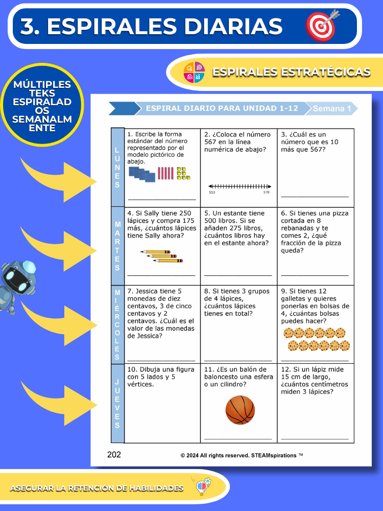 - Espirales Diarias: Hemos estructurado nuestro programa de matemáticas para garantizar una revisión continua al volver a visitar todas las habilidades previamente enseñadas cada semana, asegurando así el dominio. Normalmente, para la séptima unidad, los estudiantes están revisando más de 15 habilidades quincenalmente, cubriendo todo el material de las primeras cuatro unidades. (Resaltar espiral diaria por TEKS)