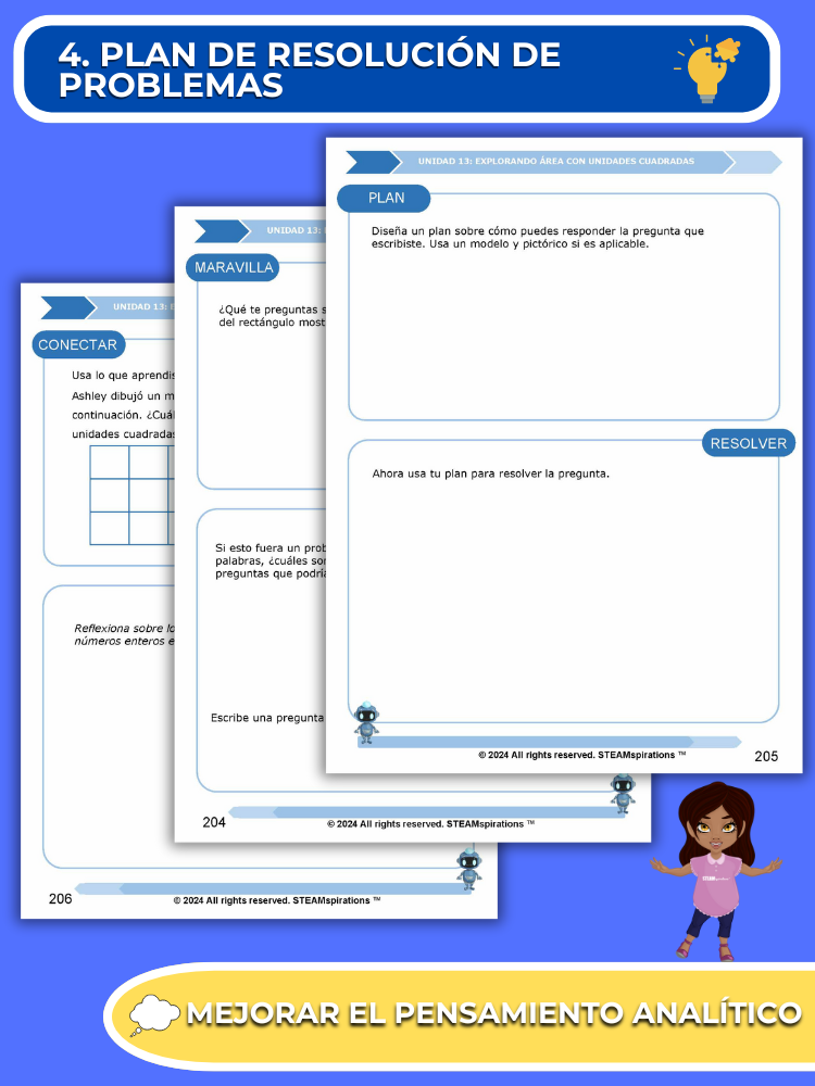 - Proceso de Resolución de Problemas: Cada unidad presenta a los estudiantes un proceso de resolución de problemas que provoca curiosidad y mejora las habilidades de pensamiento analítico.