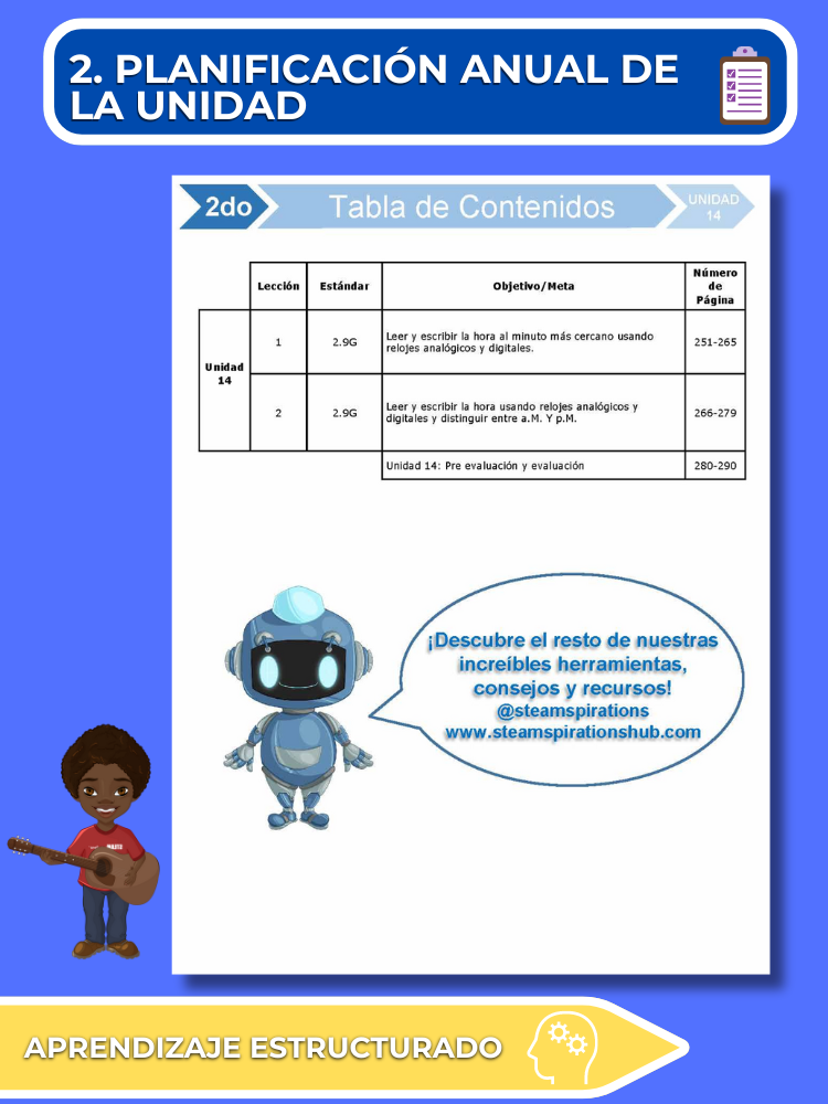 - Planificación Anual de Unidades: Nuestro plan de estudios desglosa cada TEK en segmentos manejables, construyendo el aprendizaje para un dominio completo. Este enfoque metódico permite a los estudiantes comprender completamente cada parte del TEK mientras se enseña a lo largo de las lecciones, haciendo el proceso más sencillo para los educadores.