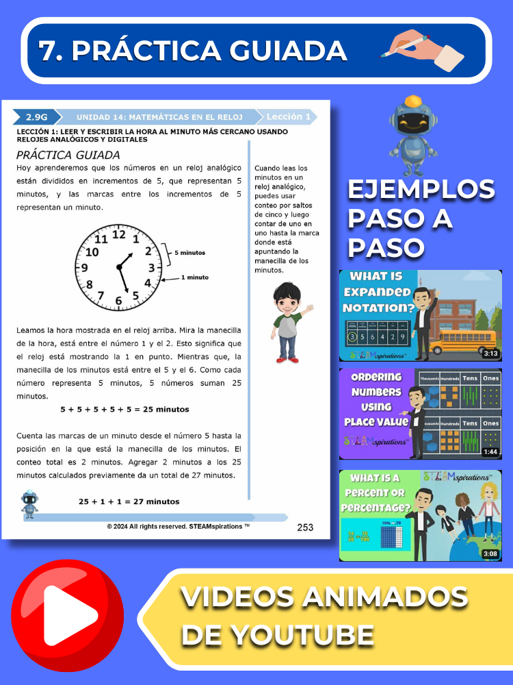 - Práctica Guiada: Cada unidad incluye secciones de práctica guiada diseñadas para enseñar efectivamente nuevos TEKs/Habilidades. Estas se pueden utilizar junto con nuestros atractivos videos de instrucción animados, mejorando la experiencia de aprendizaje.