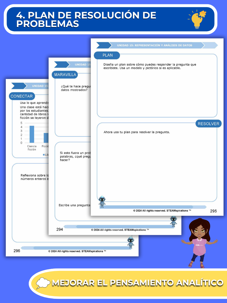 - Proceso de Resolución de Problemas: Cada unidad presenta a los estudiantes un proceso de resolución de problemas que provoca curiosidad y mejora las habilidades de pensamiento analítico.