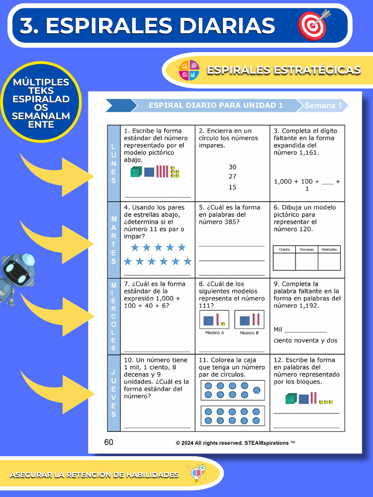 Espirales Diarias: Hemos estructurado nuestro programa de matemáticas para garantizar una revisión continua al volver a visitar todas las habilidades previamente enseñadas cada semana, asegurando así el dominio. Normalmente, para la séptima unidad, los estudiantes están revisando más de 15 habilidades quincenalmente, cubriendo todo el material de las primeras cuatro unidades. (Resaltar espiral diaria por TEKS)
