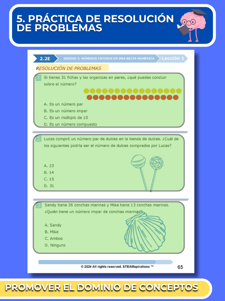 Preguntas de Resolución de Problemas: Más allá de las espirales diarias, cada lección incluye preguntas de resolución de problemas, también conocidas como preguntas del Problema del Día (P.O.D.), que refuerzan las habilidades de la lección enseñada previamente.