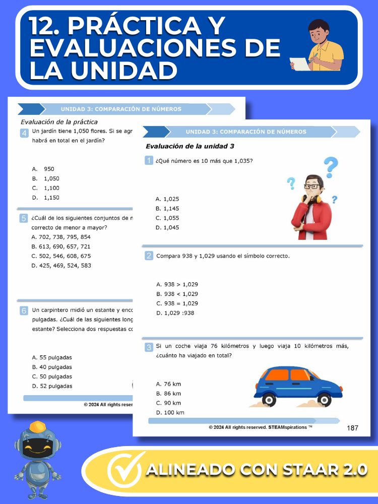 Prácticas y Evaluaciones de Unidades: Reflejando el rigor del examen STAAR, cada unidad incluye una evaluación de práctica y una evaluación de unidad integral con preguntas STAAR 2.0.
