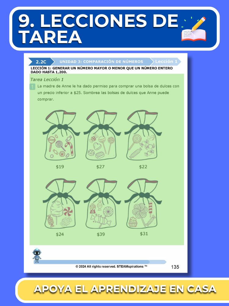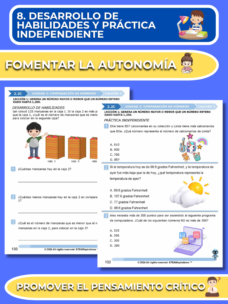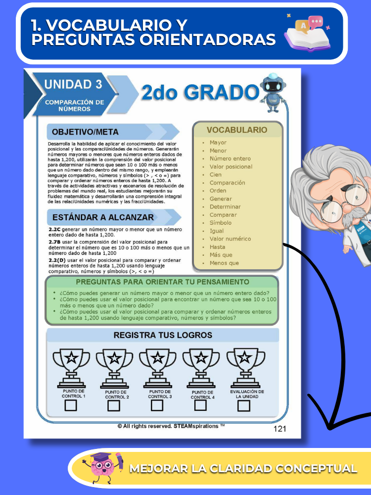 Vocabulario de Matemáticas y Preguntas Guiadas: Cada unidad introduce nuevo vocabulario de matemáticas y preguntas guiadas que pueden servir como objetivo del día o metas diarias para los maestros. Este enfoque mejora la comprensión y aplicación de conceptos y términos matemáticos, facilitando una comunicación más clara y un aprendizaje más profundo.