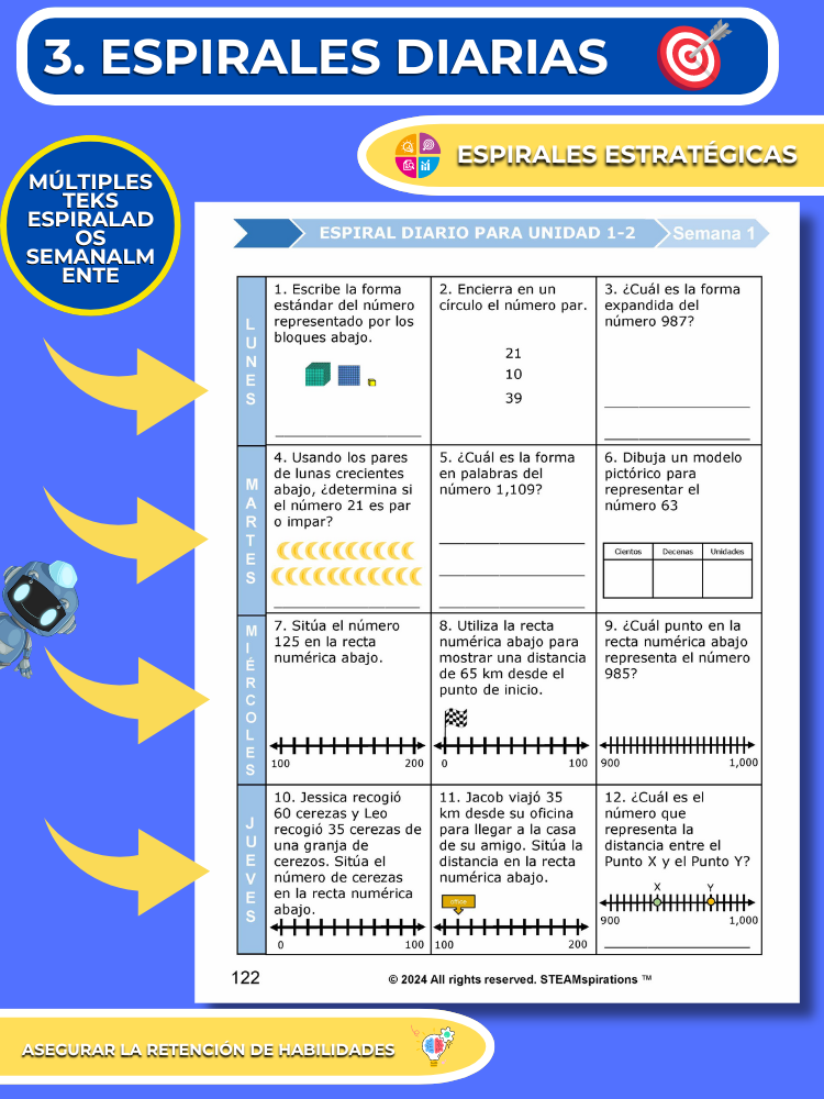 Espirales Diarias: Hemos estructurado nuestro programa de matemáticas para garantizar una revisión continua al volver a visitar todas las habilidades previamente enseñadas cada semana, asegurando así el dominio. Normalmente, para la séptima unidad, los estudiantes están revisando más de 15 habilidades quincenalmente, cubriendo todo el material de las primeras cuatro unidades. (Resaltar espiral diaria por TEKS)