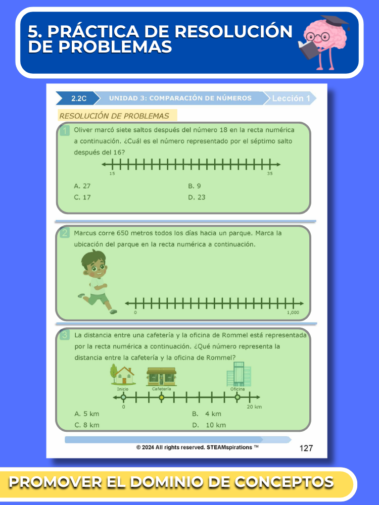 Preguntas de Resolución de Problemas: Más allá de las espirales diarias, cada lección incluye preguntas de resolución de problemas, también conocidas como preguntas del Problema del Día (P.O.D.), que refuerzan las habilidades de la lección enseñada previamente.
