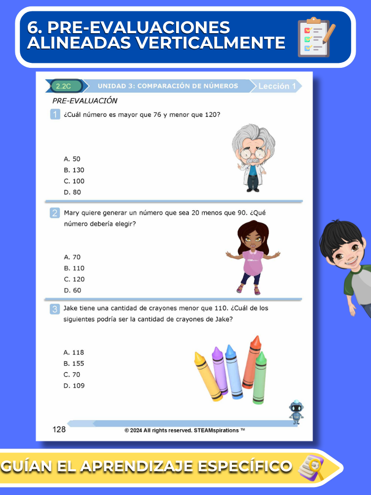 Pre-Evaluaciones Alineadas Verticalmente: Nuestro enfoque comienza cada unidad con una pre-evaluación sucinta que se alinea verticalmente con los nuevos TEKs introducidos, permitiendo un aprendizaje enfocado y efectivo.