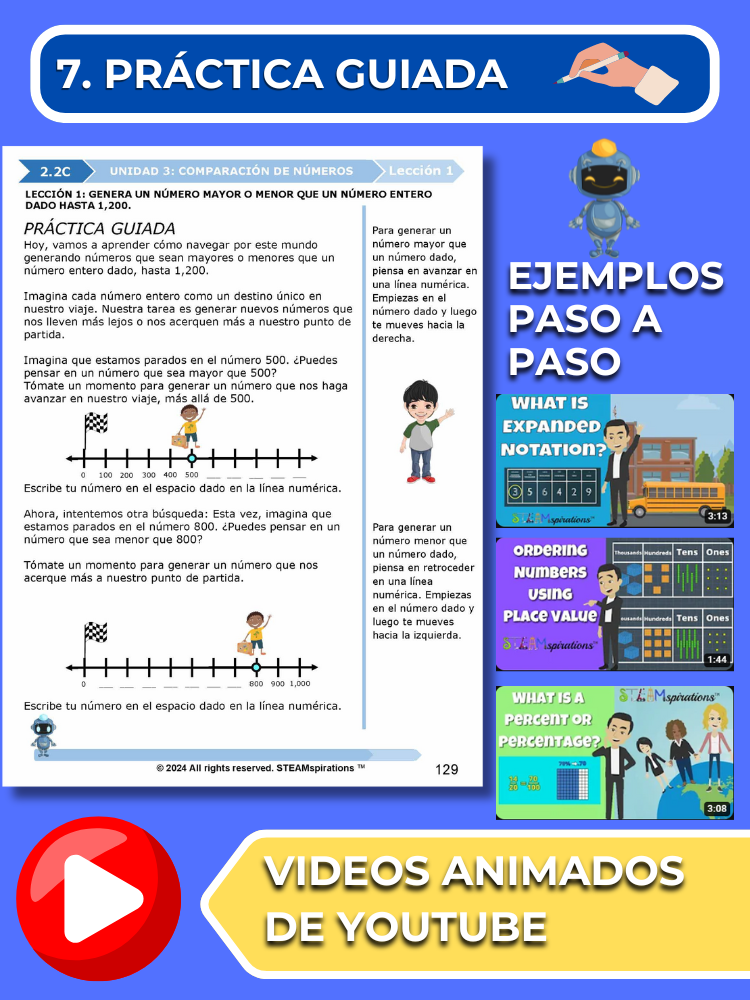 Práctica Guiada: Cada unidad incluye secciones de práctica guiada diseñadas para enseñar efectivamente nuevos TEKs/Habilidades. Estas se pueden utilizar junto con nuestros atractivos videos de instrucción animados, mejorando la experiencia de aprendizaje.