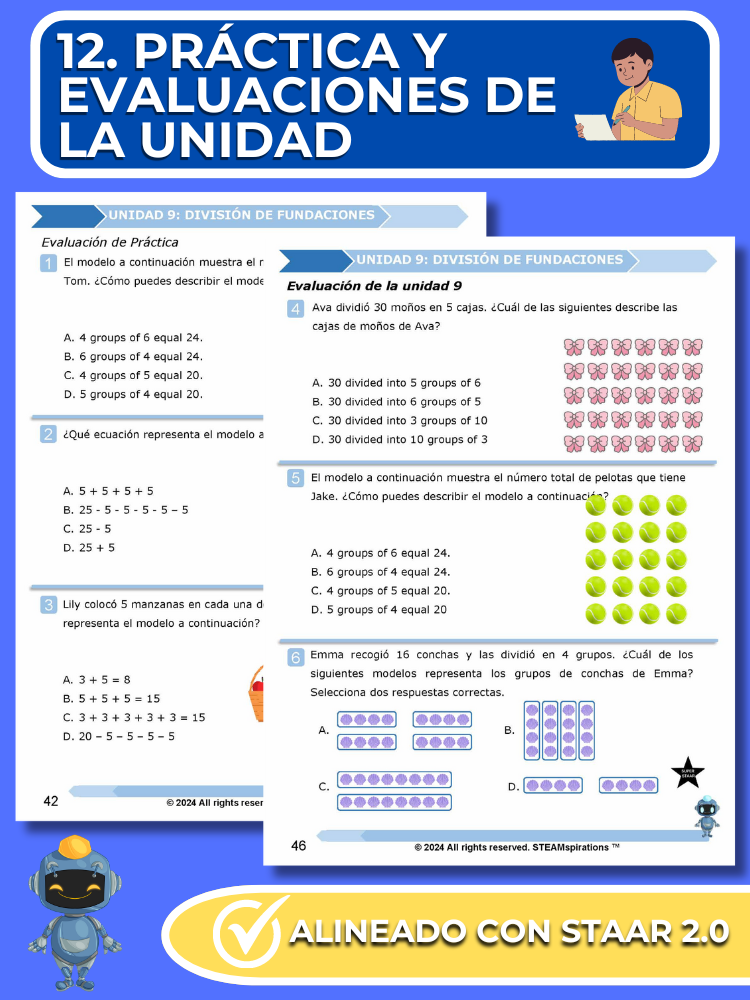 - Prácticas y Evaluaciones de Unidades: Reflejando el rigor del examen STAAR, cada unidad incluye una evaluación de práctica y una evaluación de unidad integral con preguntas STAAR 2.0.