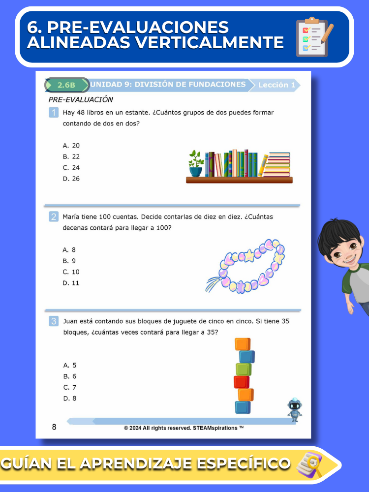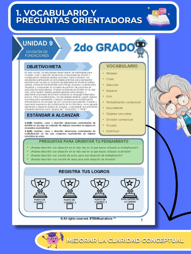 - Pre-Evaluaciones Alineadas Verticalmente: Nuestro enfoque comienza cada unidad con una pre-evaluación sucinta que se alinea verticalmente con los nuevos TEKs introducidos, permitiendo un aprendizaje enfocado y efectivo.