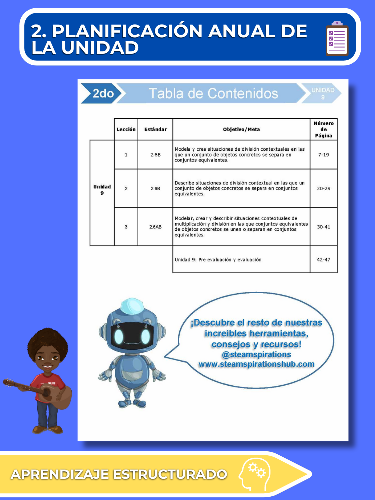 - Planificación Anual de Unidades: Nuestro plan de estudios desglosa cada TEK en segmentos manejables, construyendo el aprendizaje para un dominio completo. Este enfoque metódico permite a los estudiantes comprender completamente cada parte del TEK mientras se enseña a lo largo de las lecciones, haciendo el proceso más sencillo para los educadores.