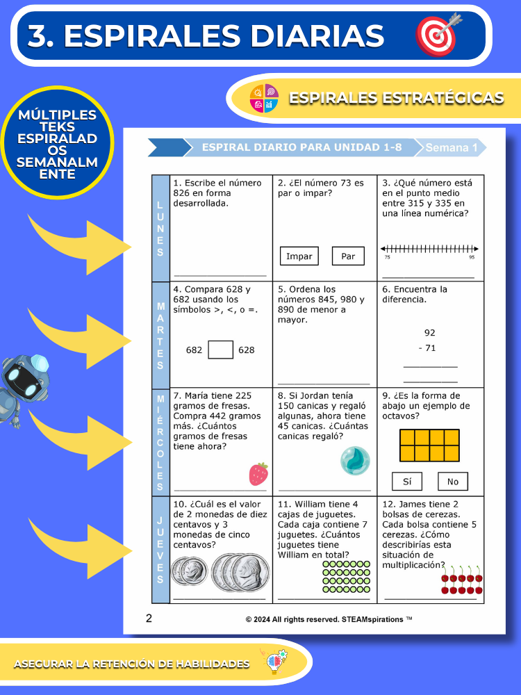 - Espirales Diarias: Hemos estructurado nuestro programa de matemáticas para garantizar una revisión continua al volver a visitar todas las habilidades previamente enseñadas cada semana, asegurando así el dominio. Normalmente, para la séptima unidad, los estudiantes están revisando más de 15 habilidades quincenalmente, cubriendo todo el material de las primeras cuatro unidades. (Resaltar espiral diaria por TEKS)