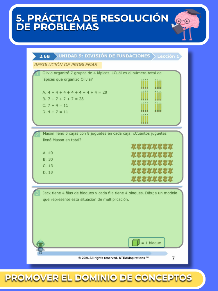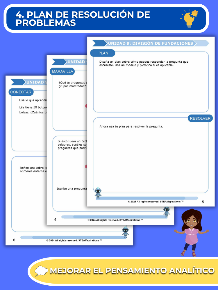 - Proceso de Resolución de Problemas: Cada unidad presenta a los estudiantes un proceso de resolución de problemas que provoca curiosidad y mejora las habilidades de pensamiento analítico.
