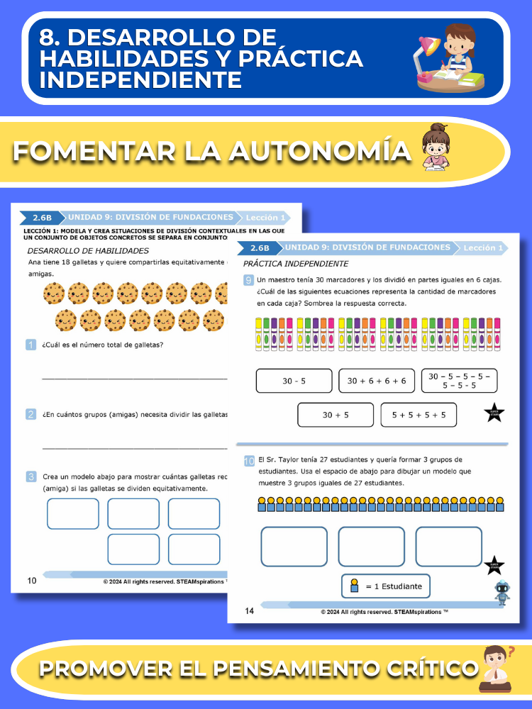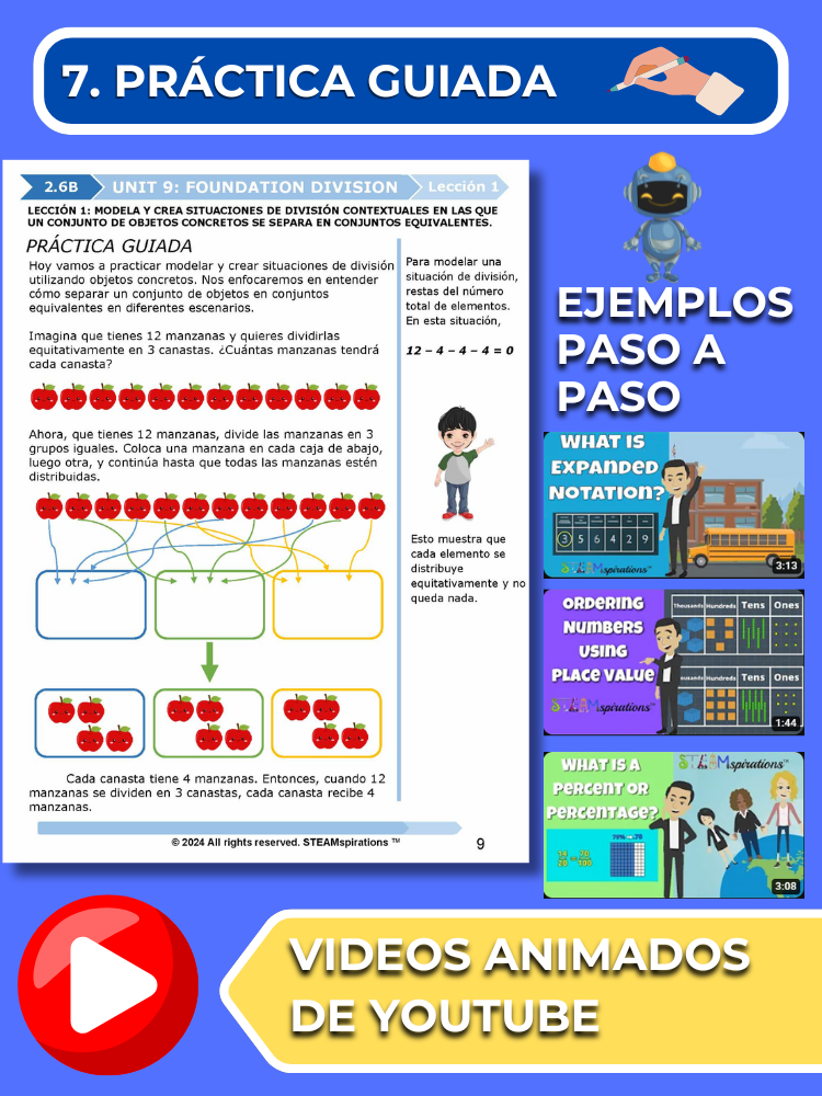 - Práctica Guiada: Cada unidad incluye secciones de práctica guiada diseñadas para enseñar efectivamente nuevos TEKs/Habilidades. Estas se pueden utilizar junto con nuestros atractivos videos de instrucción animados, mejorando la experiencia de aprendizaje.