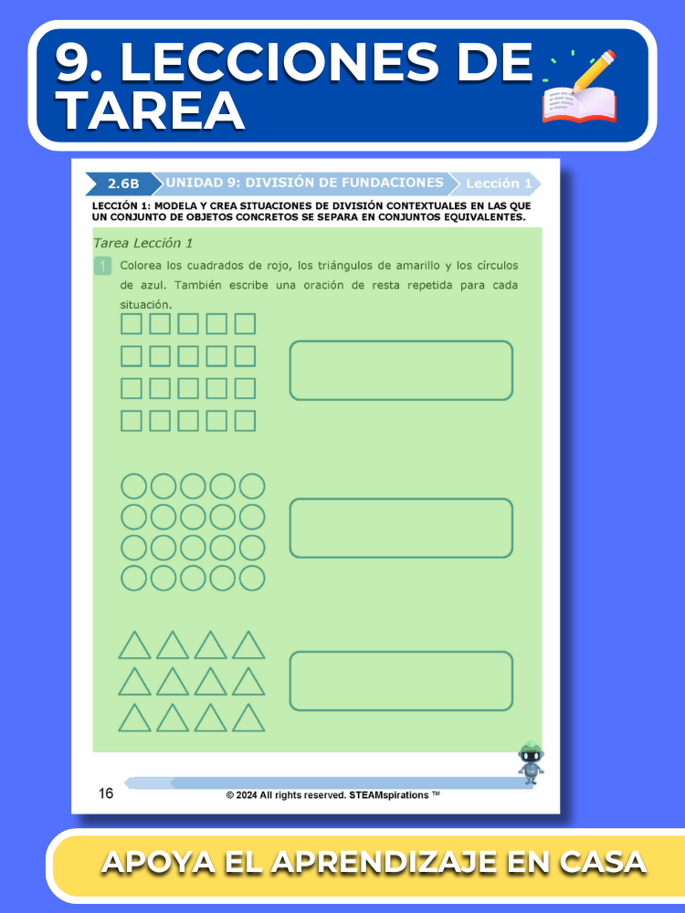 - Vocabulario de Matemáticas y Preguntas Guiadas: Cada unidad introduce nuevo vocabulario de matemáticas y preguntas guiadas que pueden servir como objetivo del día o metas diarias para los maestros. Este enfoque mejora la comprensión y aplicación de conceptos y términos matemáticos, facilitando una comunicación más clara y un aprendizaje más profundo.