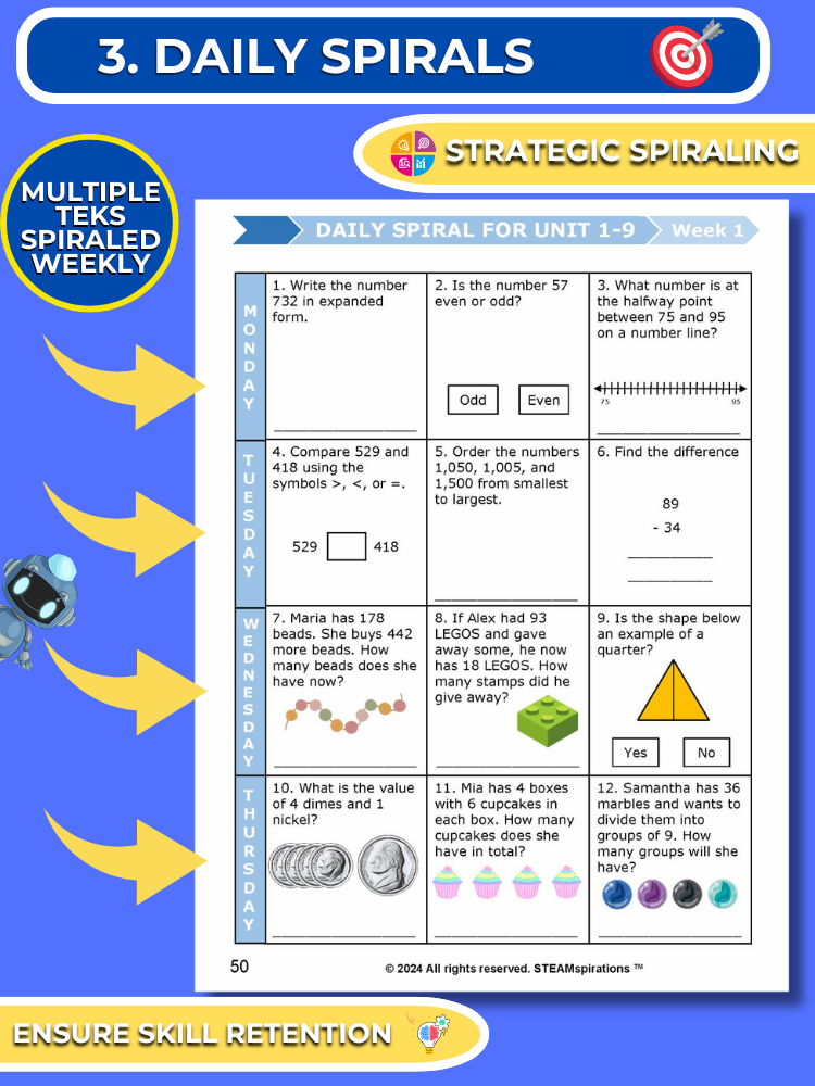 - Daily Spirals: We have structured our math program to ensure continuous review by revisiting all previously taught skills each week, thus ensuring mastery. Normally, by the 7th unit, students are reviewing over 15 skills bi-weekly, covering all material from the first four units. (HIghlight daily spiral by teks.