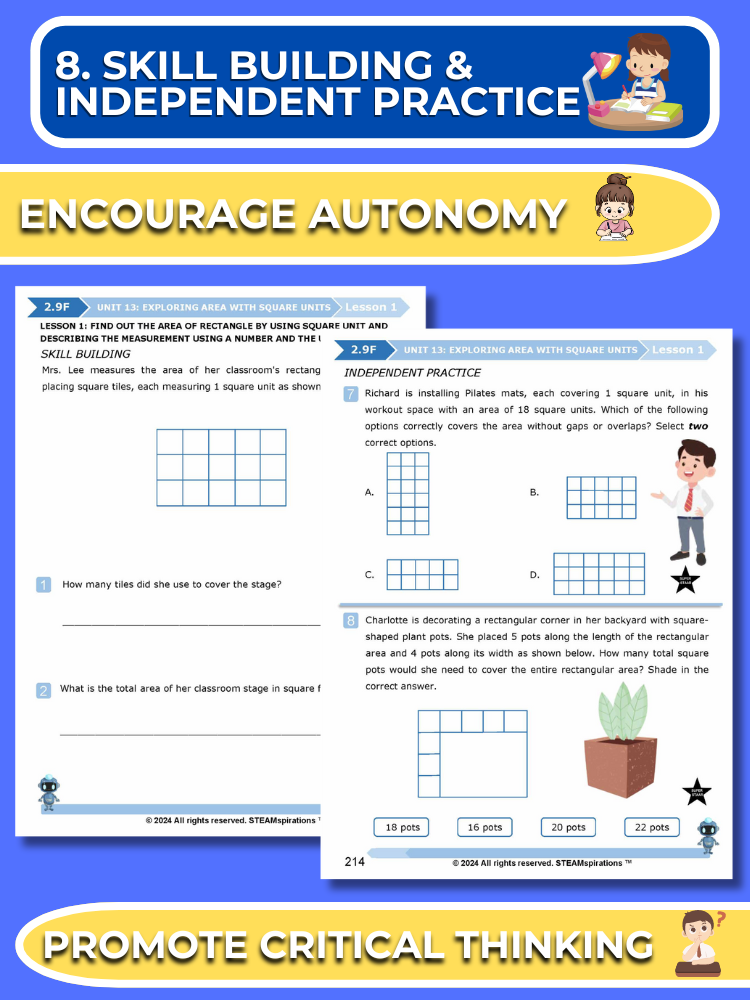 - Skill Building/Independent Practice: Lessons are designed to strengthen students’ math skills and problem-solving abilities through word problems, including STAAR 2.0 questions marked by a small star symbol.