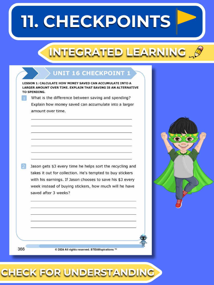 - Checkpoints: At the end of each lesson, checkpoints feature a writing exercise and a problem-solving question to assess comprehension and consolidate learning.