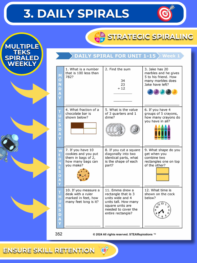 - Daily Spirals: We have structured our math program to ensure continuous review by revisiting all previously taught skills each week, thus ensuring mastery. Normally, by the 7th unit, students are reviewing over 15 skills bi-weekly, covering all material from the first four units. (HIghlight daily spiral by teks.