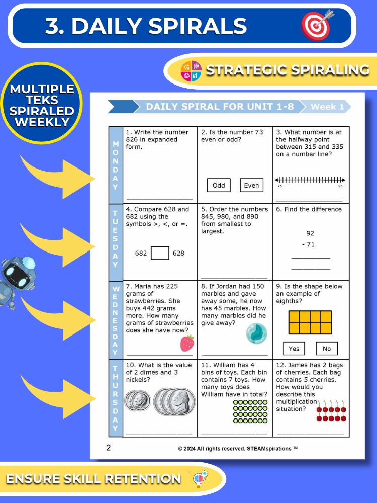 - Daily Spirals: We have structured our math program to ensure continuous review by revisiting all previously taught skills each week, thus ensuring mastery. Normally, by the 7th unit, students are reviewing over 15 skills bi-weekly, covering all material from the first four units. (HIghlight daily spiral by teks.