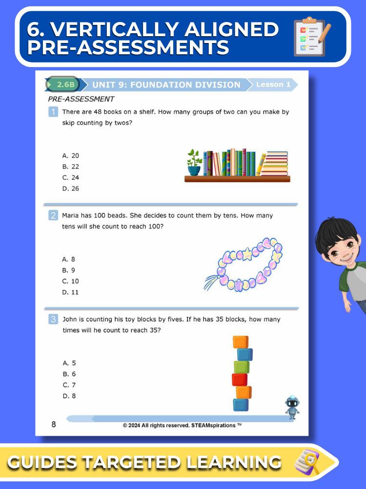 - Vertically Aligned Pre-Assessments: Our approach begins each unit with a succinct pre-assessment that aligns vertically with the new TEKs introduced, enabling focused and effective learning.