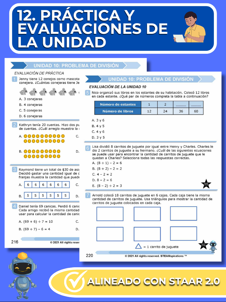 Prácticas y Evaluaciones de Unidades: Reflejando el rigor del examen STAAR, cada unidad incluye una evaluación de práctica y una evaluación de unidad integral con preguntas STAAR 2.0.